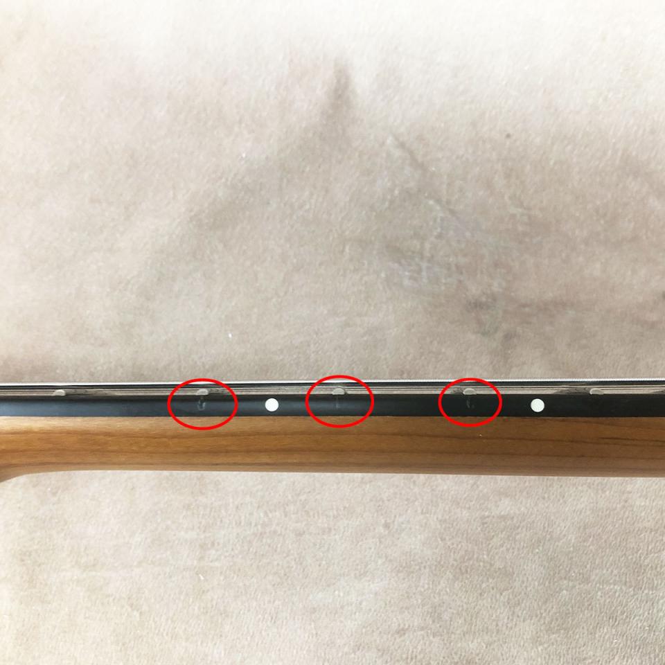 フィンガーボードはエボニーで、ドット・ポジション・マークは12フレットまでは6弦側に、以降24フレットまでは1弦側に寄ったオフセット・レイアウトになっています。