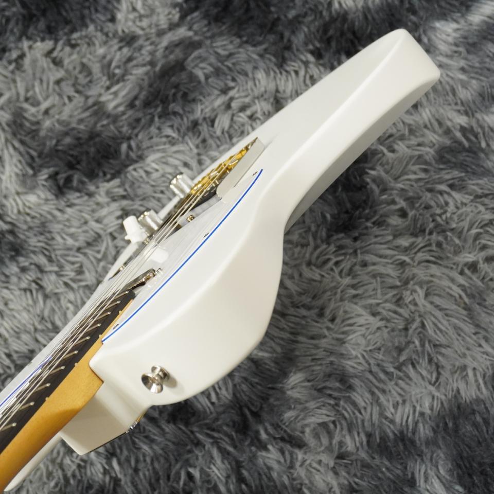 サテン仕様のホワイトなボディに、目を引くブルーのセンターレイヤーを纏った3-Plyホワイトピックガードを搭載しており、ボディとマッチングさせたヘッドに輝くブルーメタルロゴと相まって軽快な雰囲気を醸し出します。 プラスチックパーツも全てホワイトで統一することで、より純白さを際立たせます。