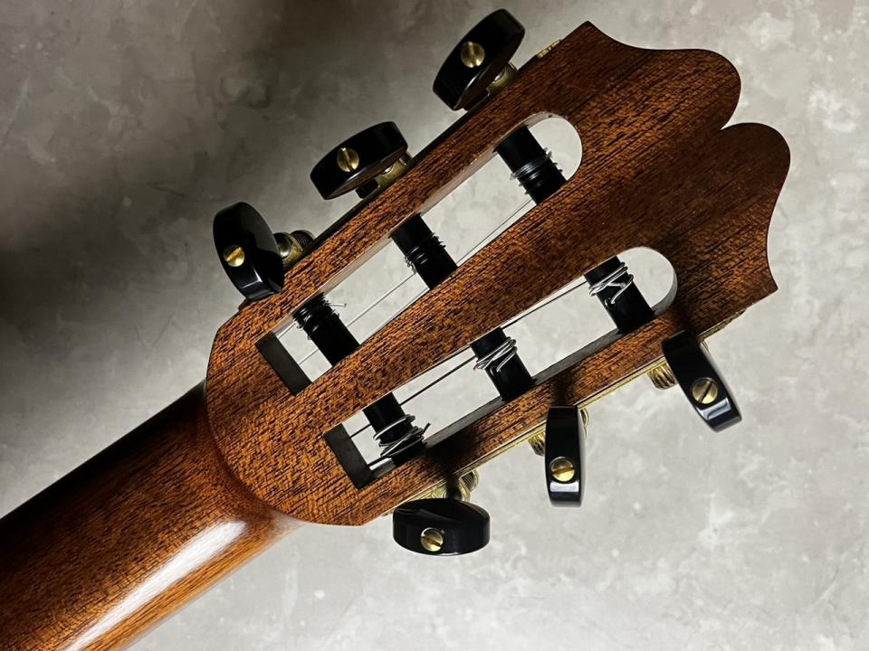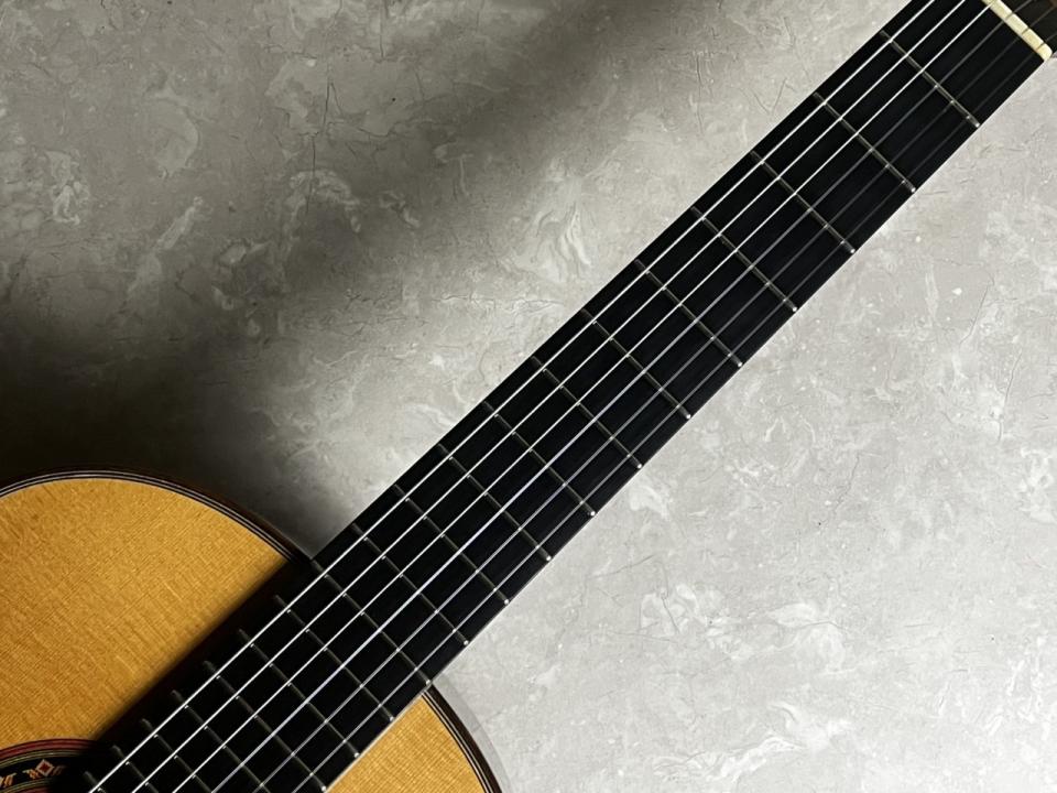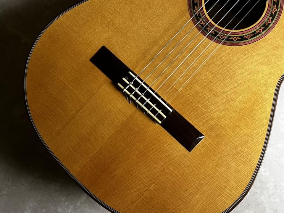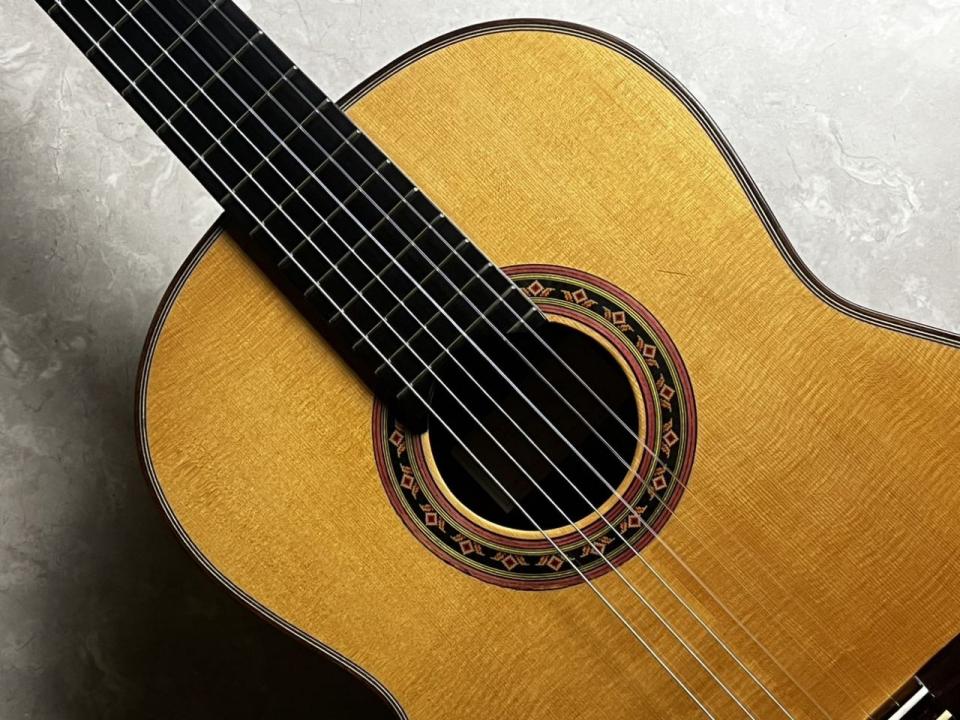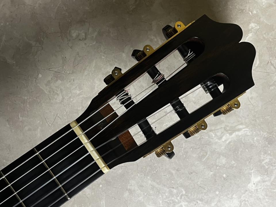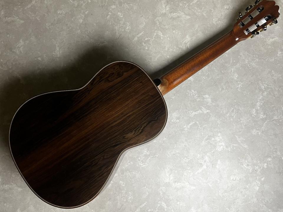 表板は松、横裏板はブラジリアンローズウッド、通称「ハカランダ」を用いた希少なギターです。2007年に手工品クラシックギターとして製造され、現在は中々手に取る事の出来ないハカランダを使用しており、豊かなサスティーンと潤った低音から、クラシックギターの真骨頂のようなサウンドとなっております。