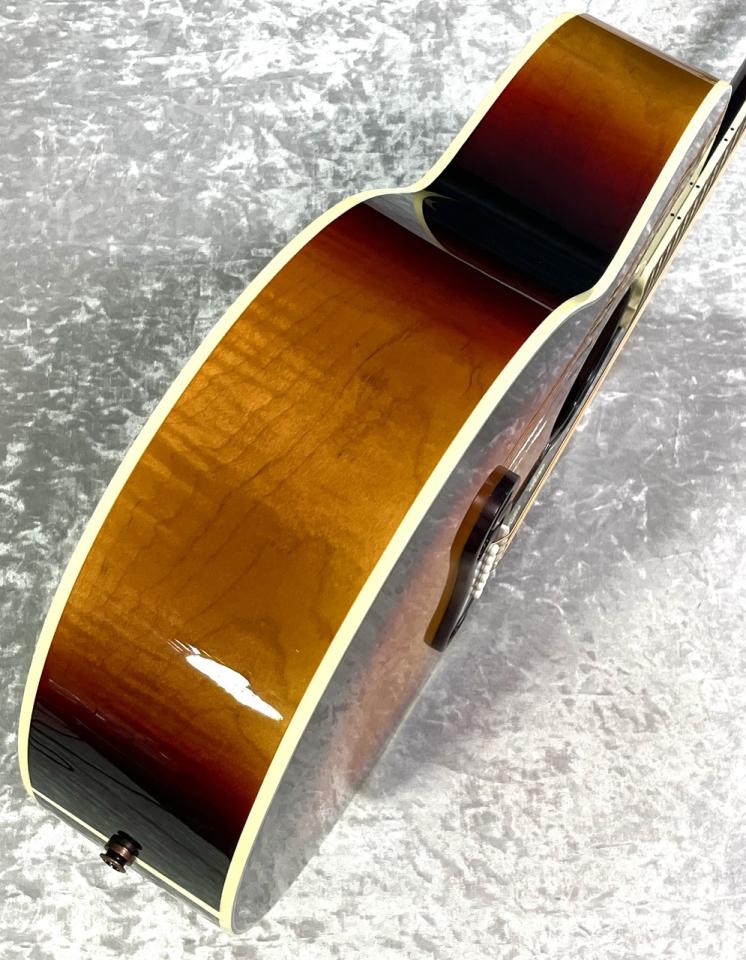 スーパージャンボシェイプのボディを構成する材には、トップはAAAグレードのシトカ・スプルース、サイド&バックには杢目の美しいAAAメイプルを採用しております。