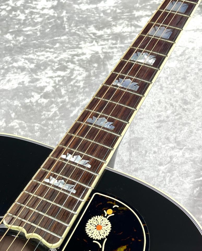 マザー・オブ・パールのギブソンロゴ・クラウンヘッドインレイ・クラウンポジションマークインレイなど豪華な装飾もJ-200を象徴する仕様たちですね。