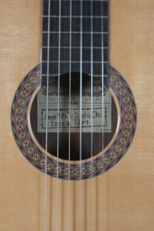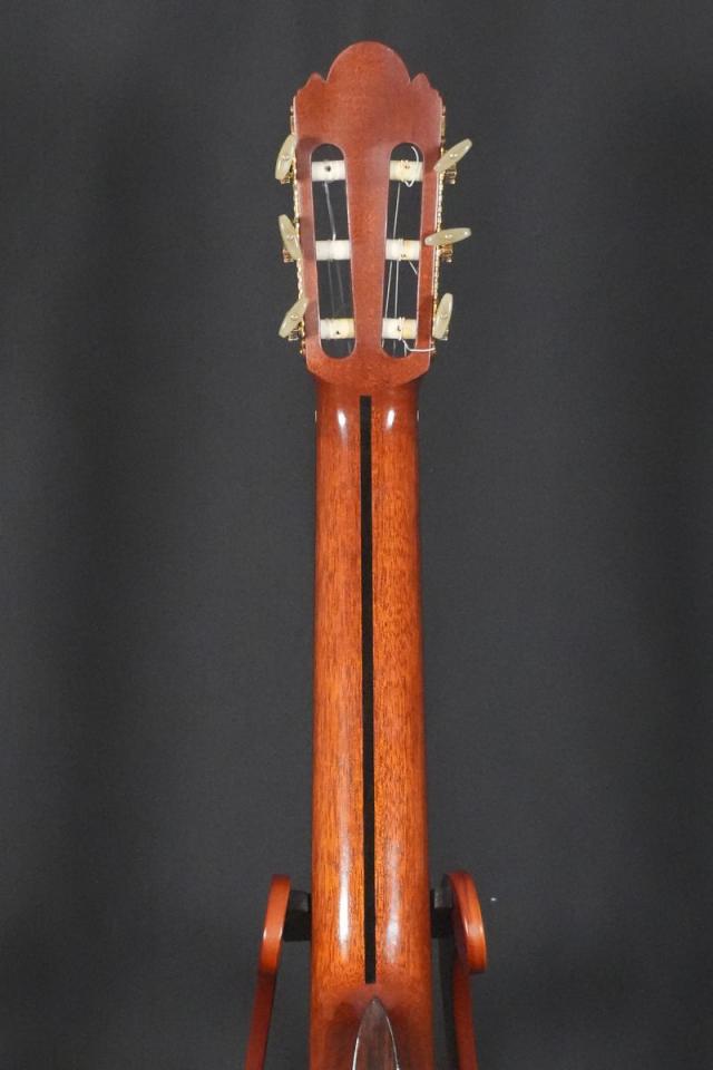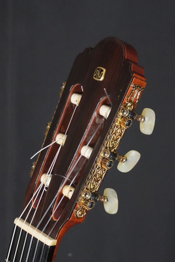 新堀ギター学院向けのプライムギター(つまりは一般的なクラシックギターです)で、ヘッド飾りとラベルに印があります。
