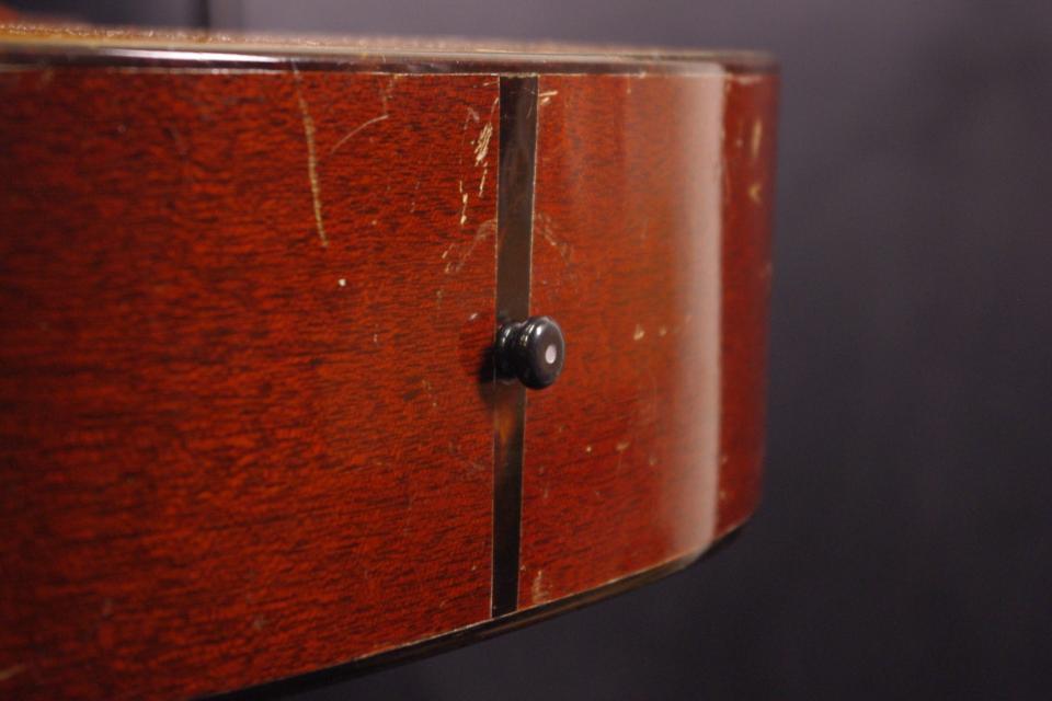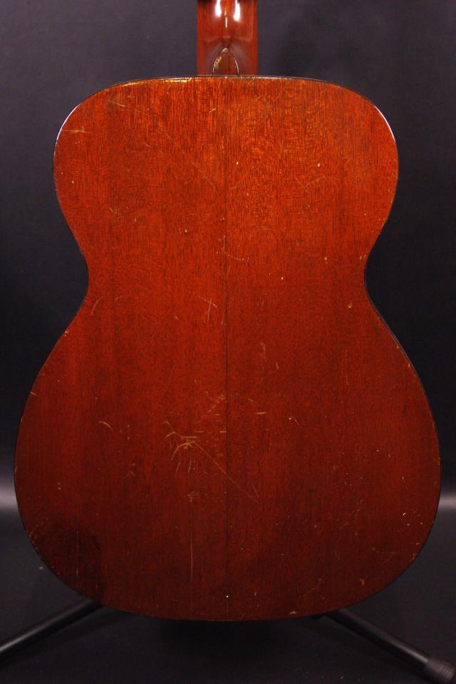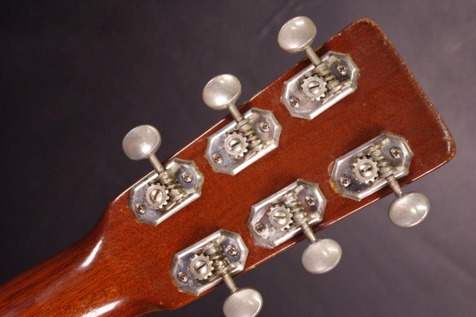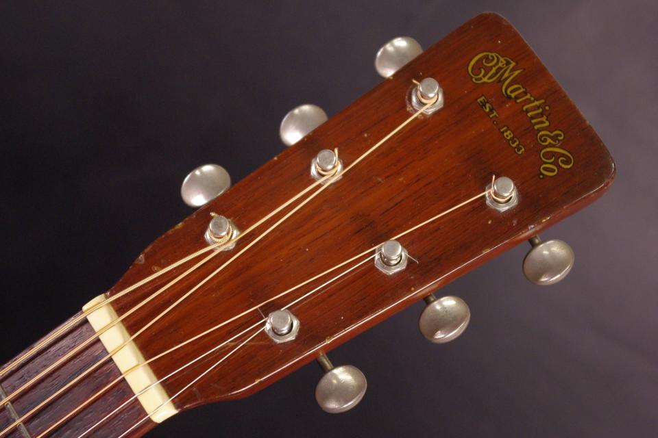 1951年製の貴重なビンテージ!マーティン 000-18が入荷しました!!ドレッドノート比べると抱えやすいボディ形状が魅力!トップはシトカスプルース、サイドバックにはマホガニー、指板とブリッジにはハカランダを採用しています。生産から70年以上経過しておりクルーソン製のオープンペグ、べっ甲柄ピックガード、ハカランダブリッジなど主なパーツはオリジナルで残っていました。ピックガードの内側とバックの左下に2箇所クラック補修箇所があります。サイドにヘアラインクラックの補修箇所、サウンドホールと周囲に弾き傷、全体的に傷、ウェザーチェックは入っていますがビンテージの雰囲気が堪りません!調整も行き届いており演奏性、サウンドも抜群によいです!ネックヒールへのストラップピン加工、またピックアップの取り付け加工はございません。エンドピンは交換されています。ナット幅は約42mm、太すぎない握りやすいグリップです。フレットは交換済みで高さに余裕があります。ネックはリセット調整済みで理想的です。弦高は12フレット6弦側で約2.6mm、1弦側で約1.7mmの高さでハイポジションまで押さえやすく調整しています。サドル残もしっかりと確保していますのでお好みに合せた微調整にもお応えいたします。70年かけて大切に弾きこまれていますので素晴らしく乾いた味わい深いサウンドで仕上がっています!低中音が豊かで高音の抜けも良いです。軽いタッチで響きます!是非この機会にお試しください!店長一押し!!汎用ハードケース付き