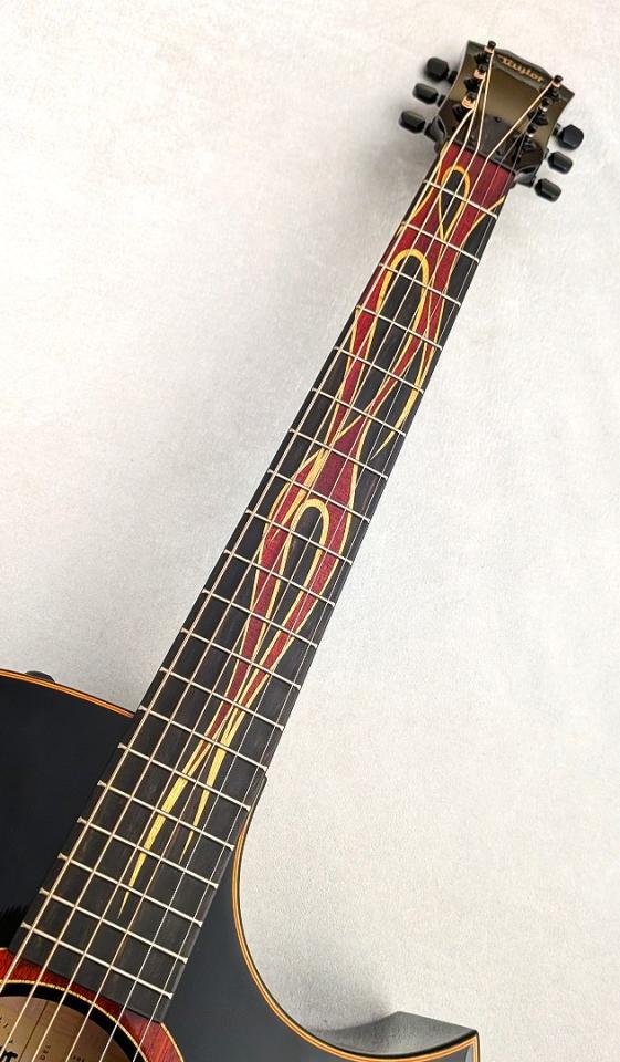 指板とサウンドホールロゼッタにはファイヤーパターンが施されております。