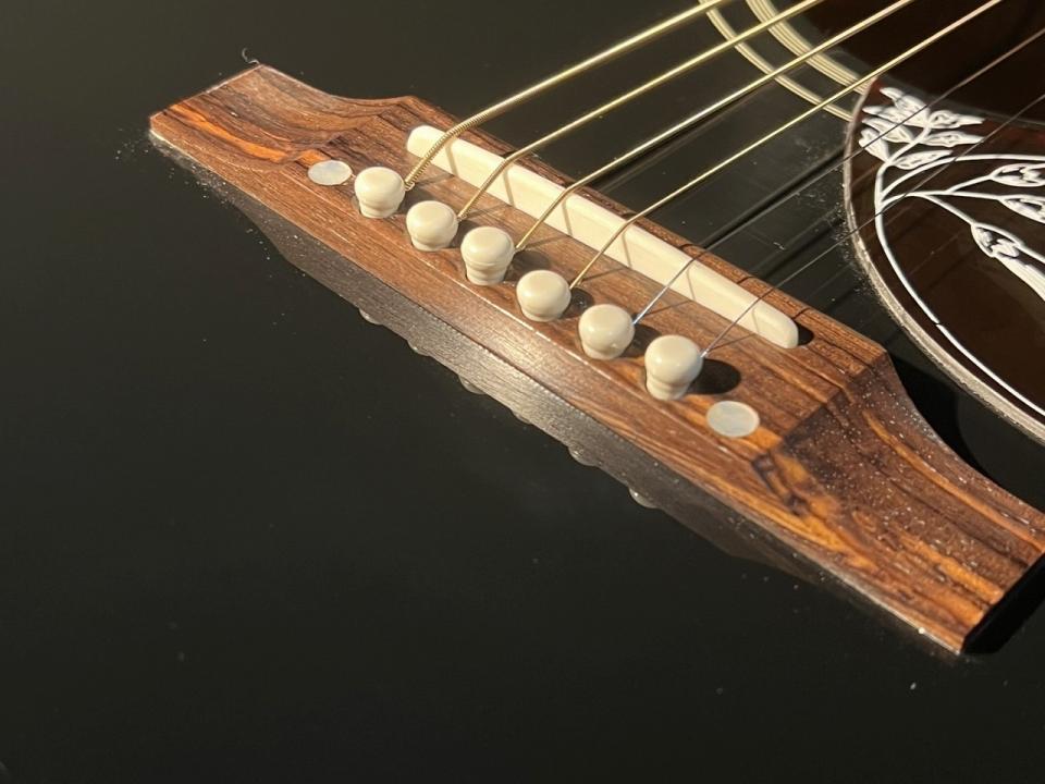 バインディングが巻かれたヘッドにはMOP(白蝶貝)によるレトロ感のあるスクリプトロゴ。L-5やアコースティックモデルではSJ-200 Western Classicに採用されているフラワーポットタイプのトーチインレイ、更にはGroverのオープンバックタイプペグを搭載し高級感を増しています。