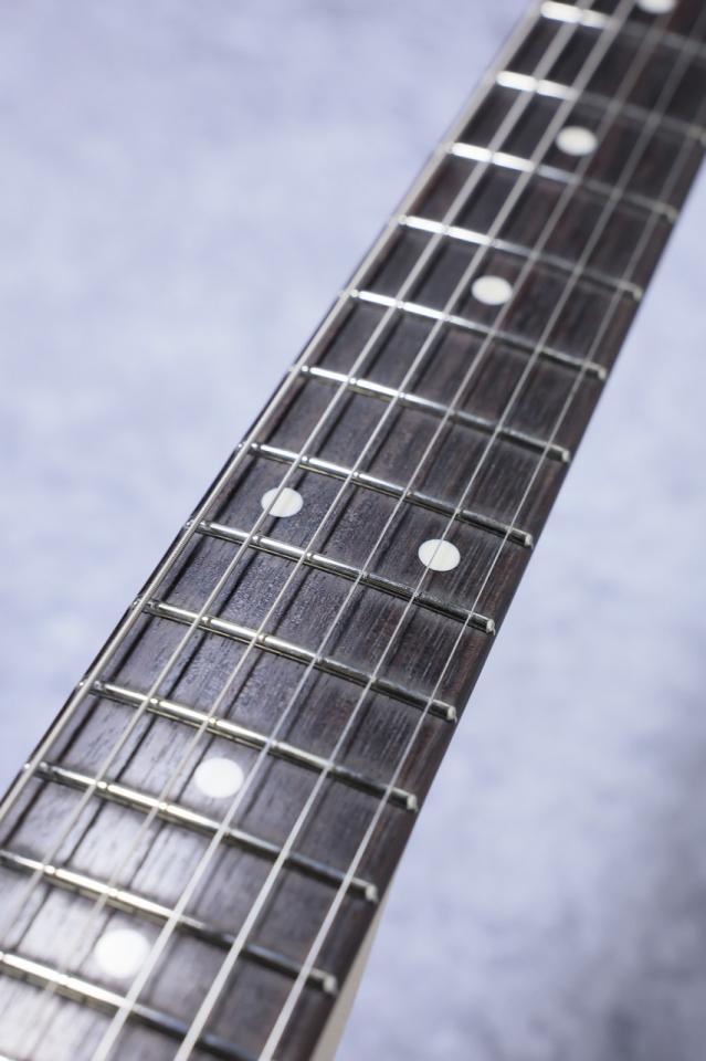 ミディアムジャンボフレットに9.5R、ストラトらしさを残しつつプレイヤビリティにも寄り添った考え抜かれたスペックは、長年の経験があるビルダーならではの思想です。