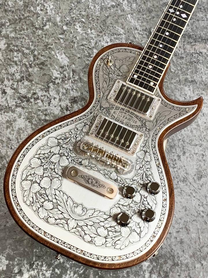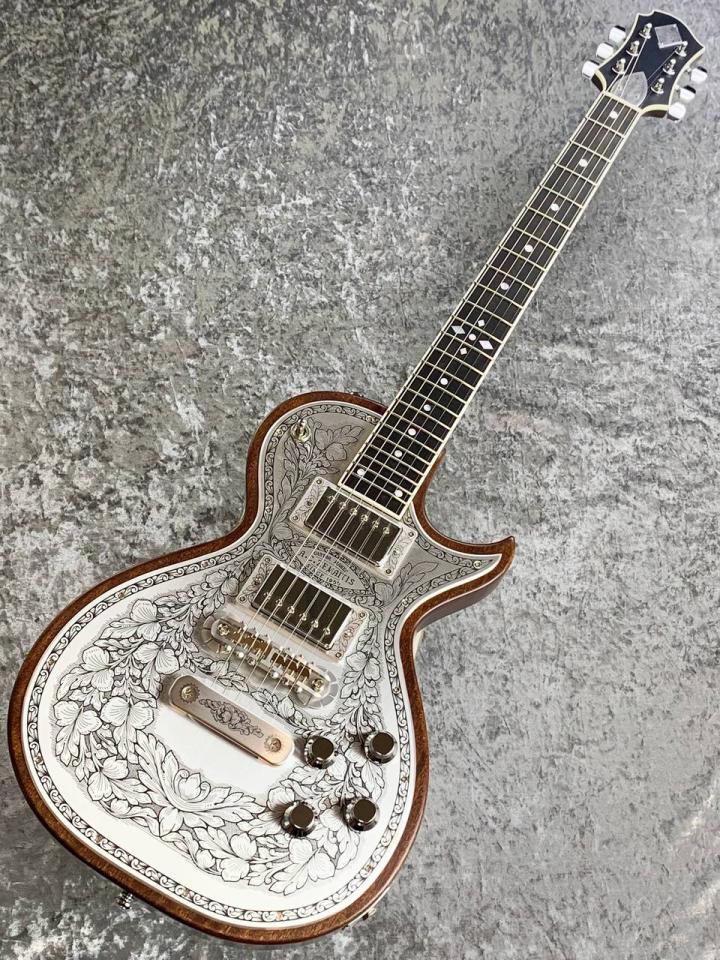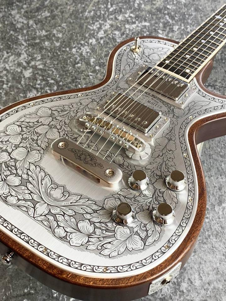 同様にアルミ合金を用いたヘッドのダイアモンド・エンブレム、トラスロッド・カバー、テイルピースやピックアップ・リングをはじめ、アウトプット・ジャック・プレート、コントロール&スイッチ・バック・プレートに至るまで彫金を施しています。