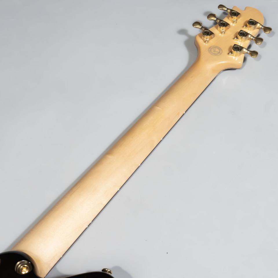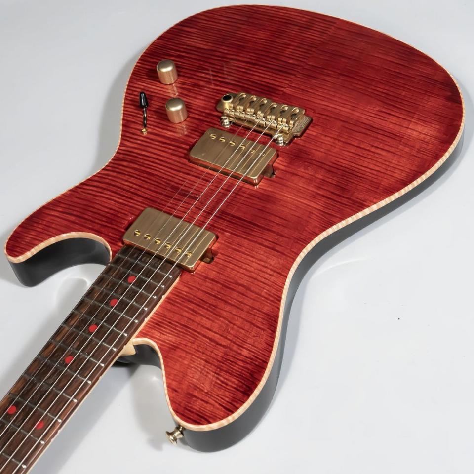 やや明るめのGarnetカラーが映えるようきめの細かいフレイムメイプルを選定しました!端から端まで妥協のない杢目はさすがの一言です。ポジションマークは全体の統一感を出すためレッドコーラルを採用。