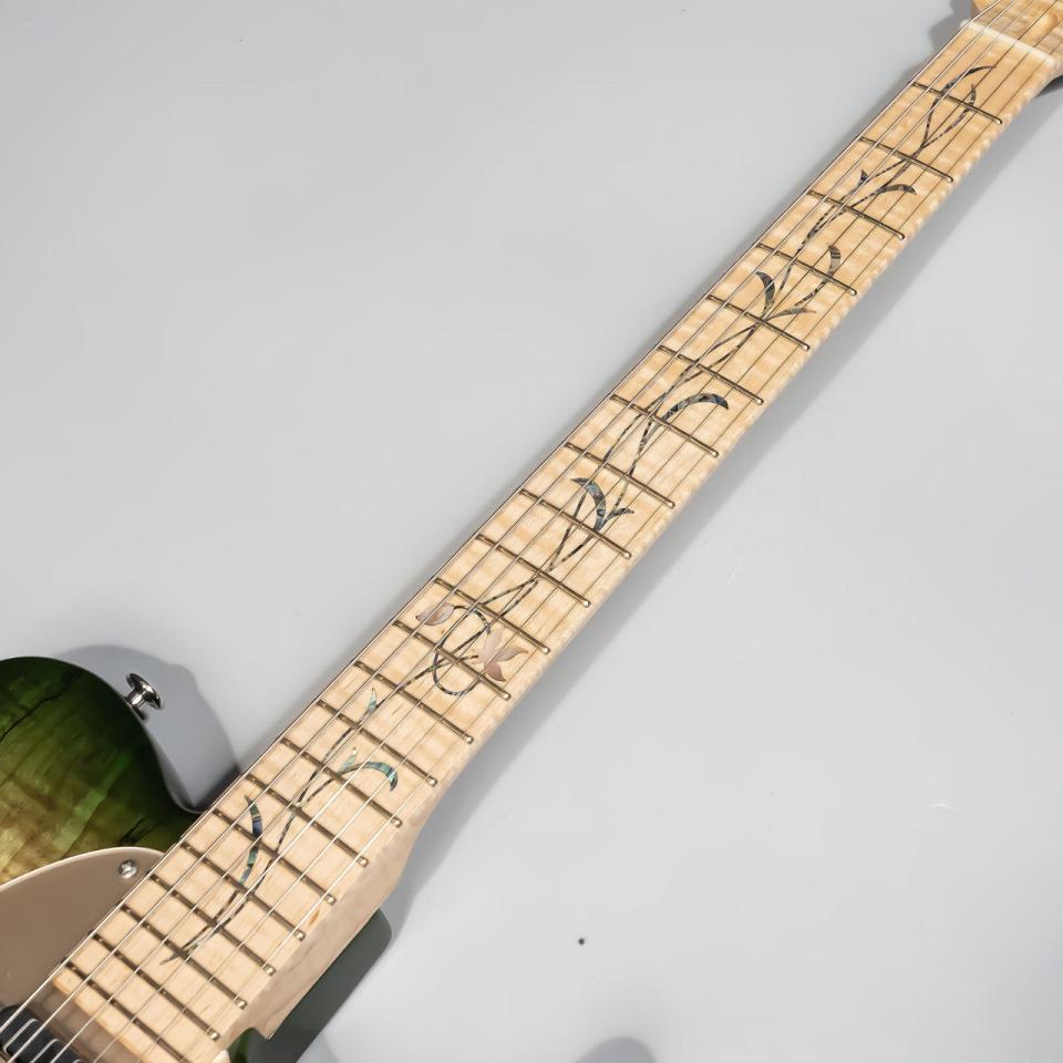 ギターの材の中でも非常にメジャーな材であるメイプルですが、フレイム杢でもキルト杢とも言えない、独特の美しい模様の現れた飛鳥工場秘蔵の「エキゾチックメイプル」をボディトップに採用しています。