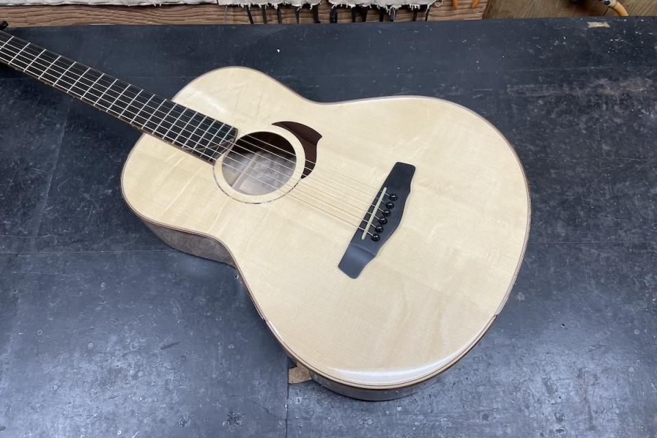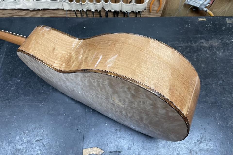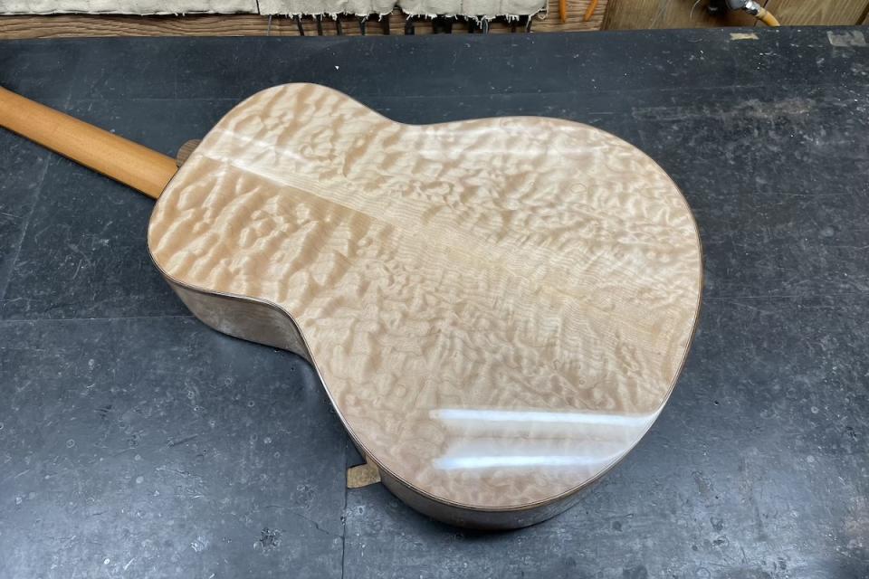 こちらのモデルは、美しいベアクロウの入ったジャーマンスプルースをトップに、バック&サイドにはストックしていた極上のキルテッドメイプルを採用しました。素晴らしい杢のメイプル材です。