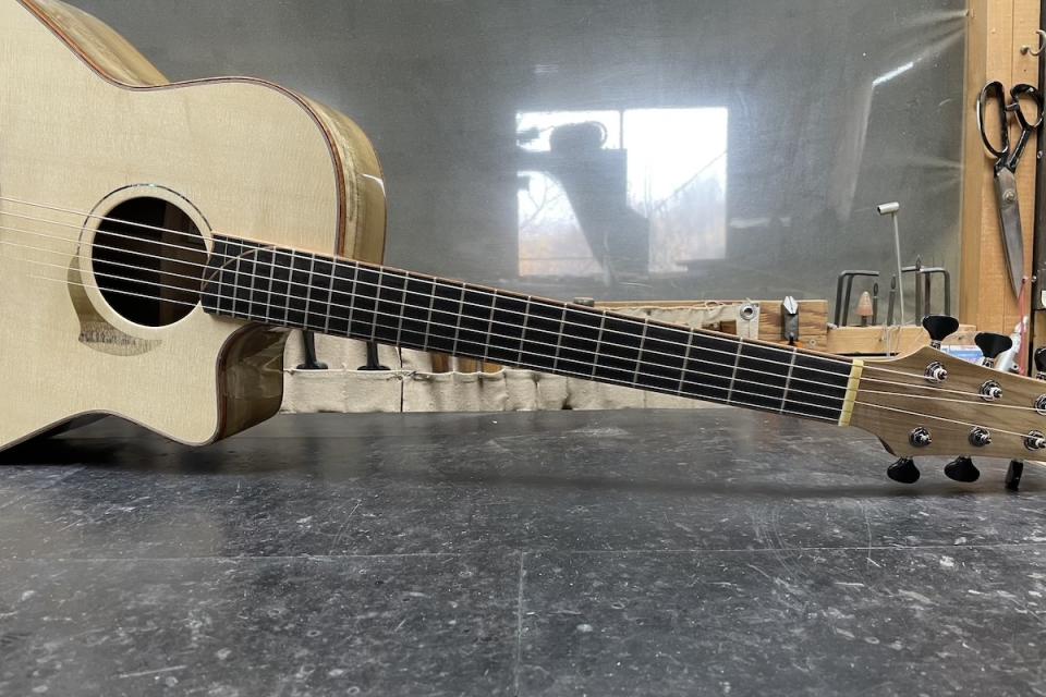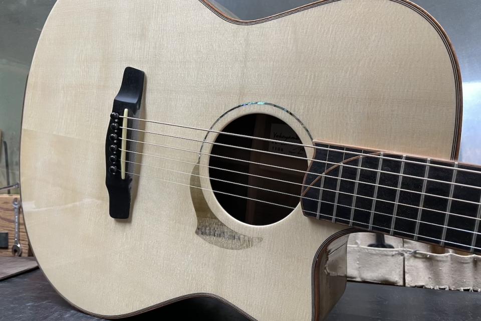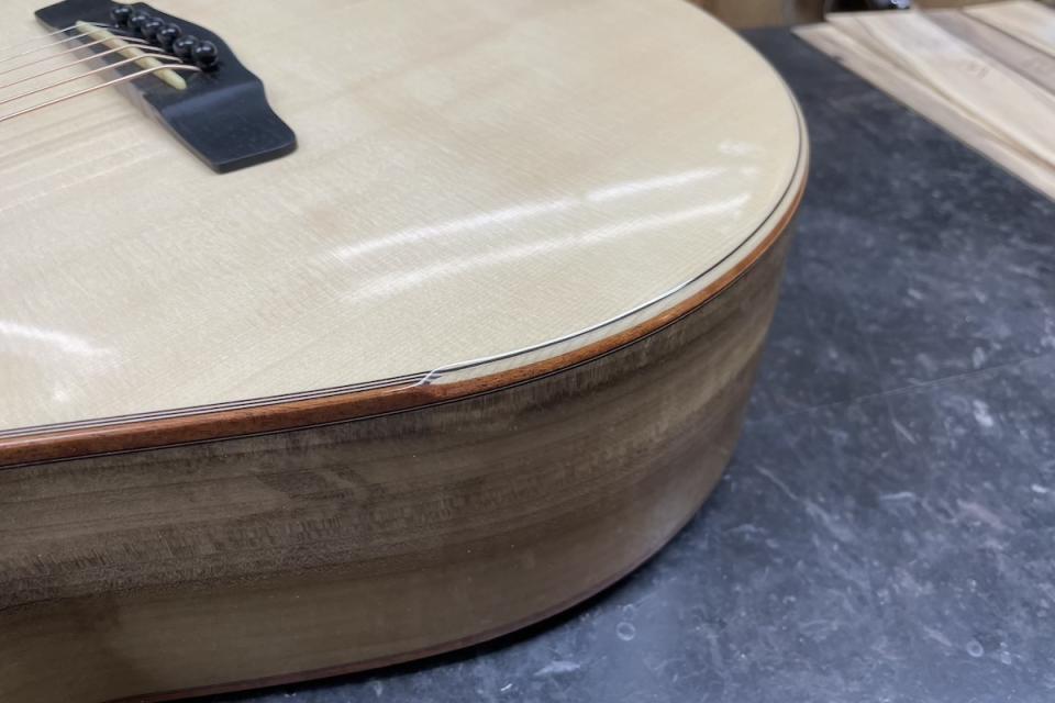 美しいベアクロウの入ったジャーマンスプルースをトップに、バック&サイドには稀少な朴(ほお)材を採用しました。しかも、フレイムのびっしり入ったプレミアムグレードの材料です。