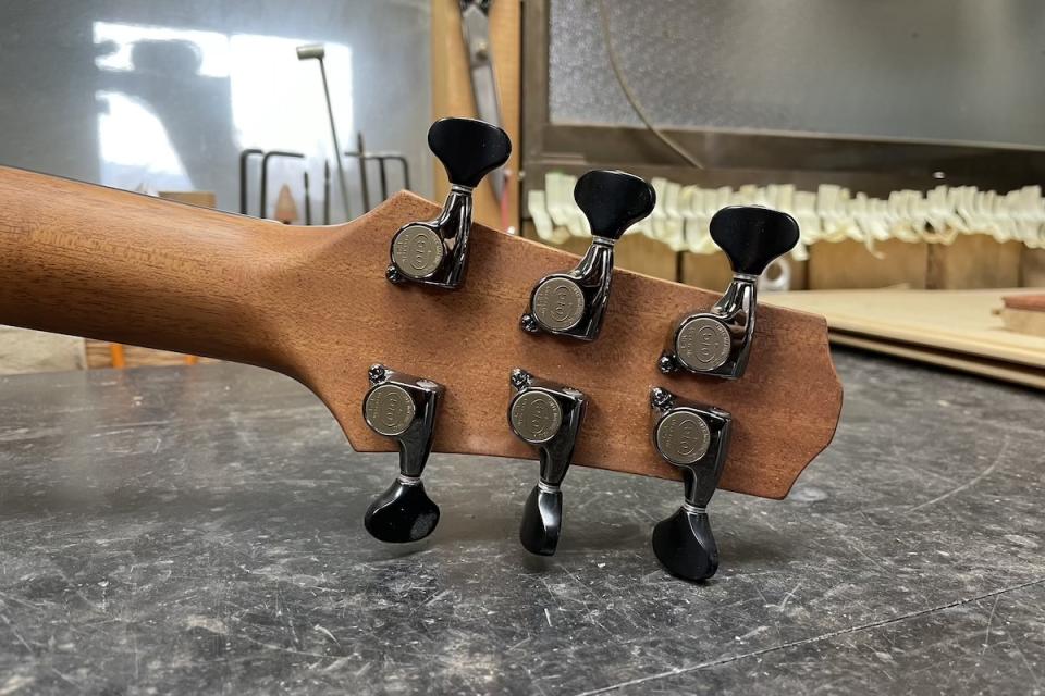 指板&ブリッジ駒にはエボニー、バインディングには、ベッコウ柄のセルを採用しています。ヘッドトップはけやき材、ロゼッタには奥多摩産のもみぢを合わせています。