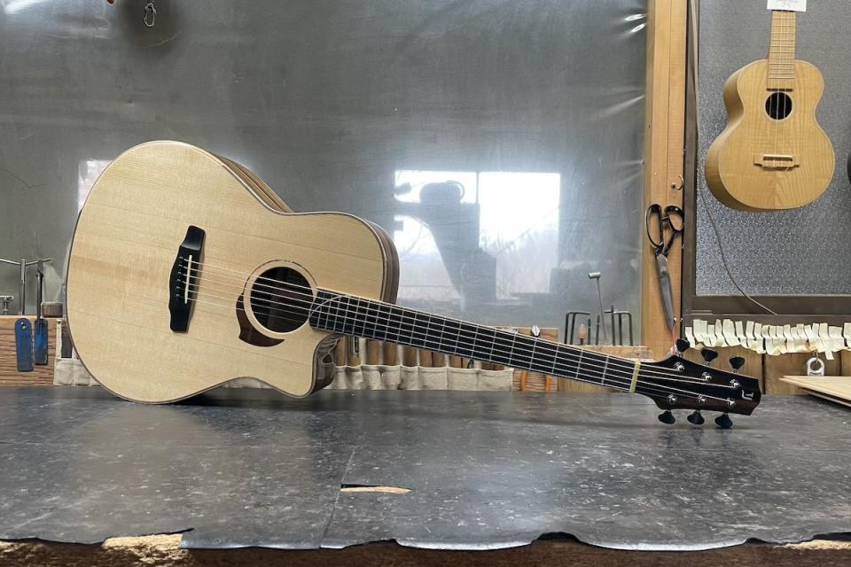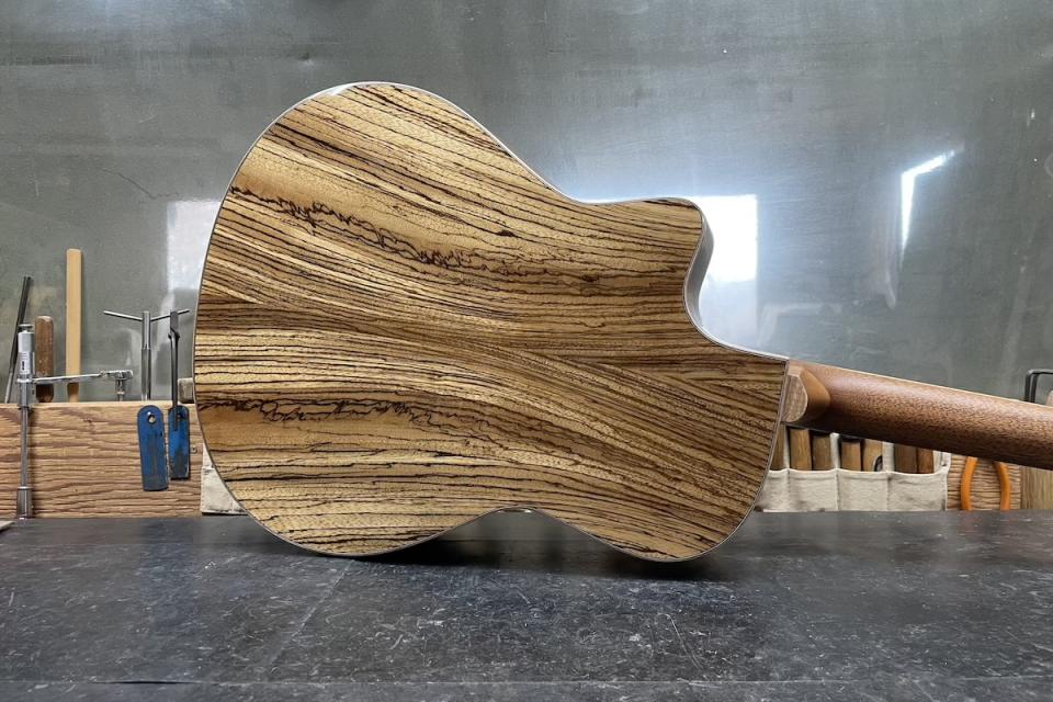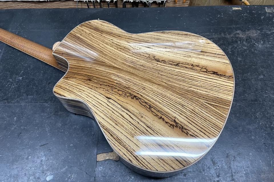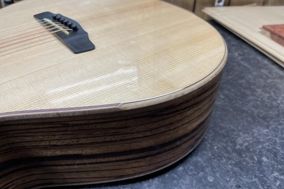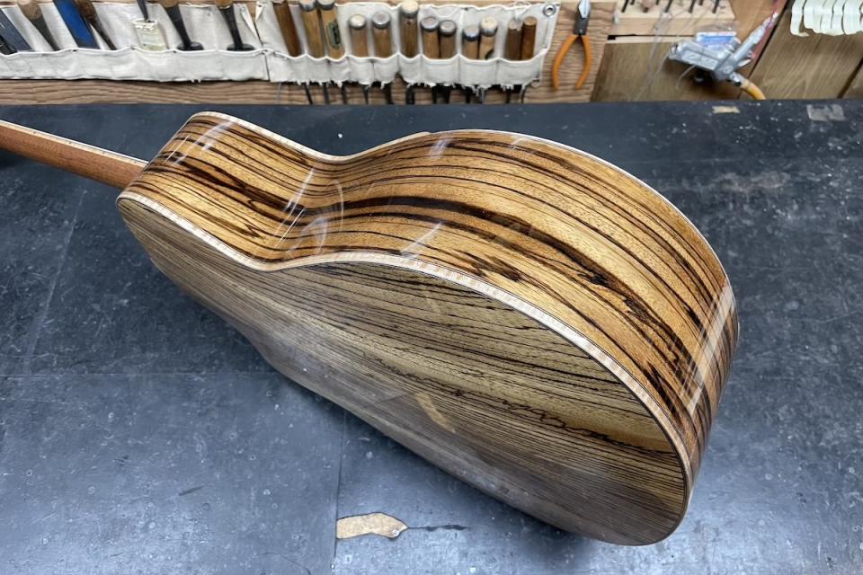 しっかりと寝かせたホワイトスプルースに、きれいな杢のゼブラウッドをバック&サイドに採用しました。なかなかお目にかかることのできない、なんともドラマチックな杢目です。