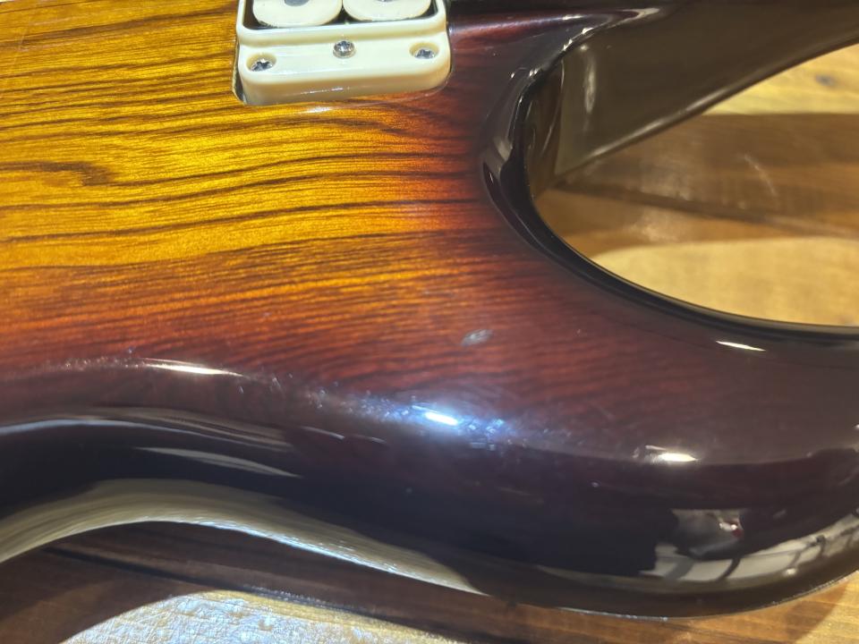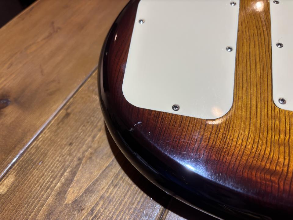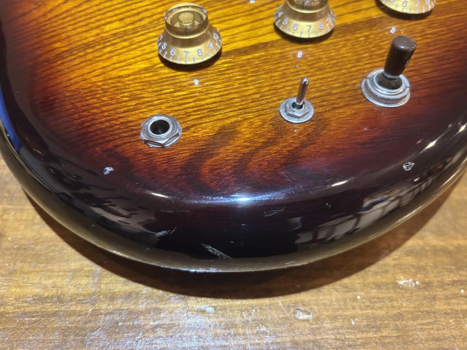 またフロント・ピックアップのボリュームノブにクラック、ブリッジ1弦側スタッドの頭の部分が1部欠けていますが、どちらも演奏上の問題はありません。