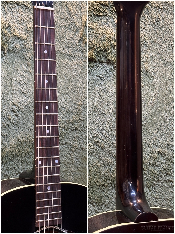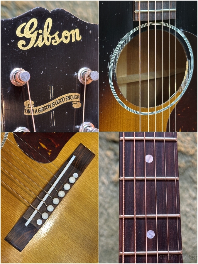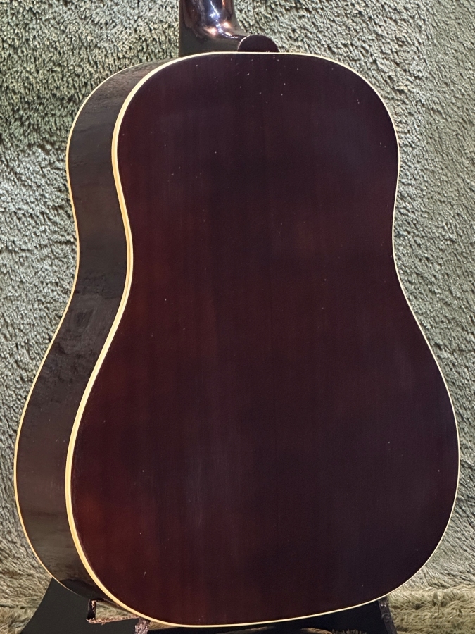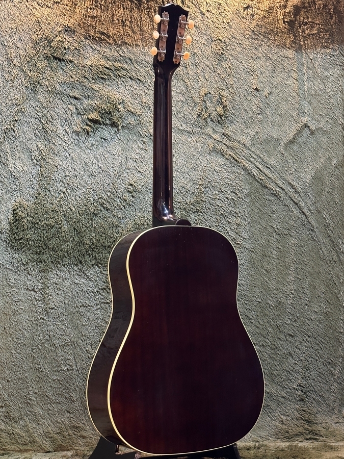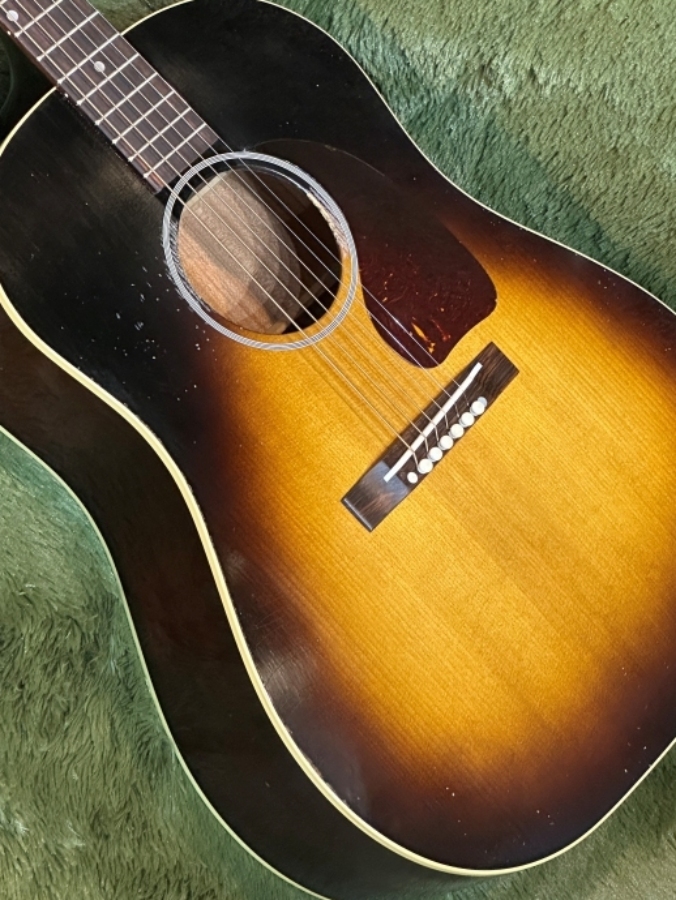 ギブソン・オリジナルシェイプの『ラウンドショルダー』と呼ばれるなで肩のボディのトップ材には、1942年当時に使用されていたとされる『アディロンダック・レッド・プルース』を使用。さらに特殊な熱処理により木材に炭素化する直前まで細胞レベルで変化を与える事で、長年使用されたヴィンテージ楽器と同様のサウンドが得られる『サーマリー・エイジド』加工が施されています。(Xブレーシングもレッド・スプルースを使用しニカワで接着)サイド&バックには純種の『ジェニュイン・マホガニー』中南米エリアの主にグァテマラン産を使用され、全体的に軽量な仕上がりです。ネック材も同様にジェニュイン・マホガニー、指板&ブリッジには『インディアン・ローズウッド』を使用し、発売当初のマテリアルも限りなく再現。