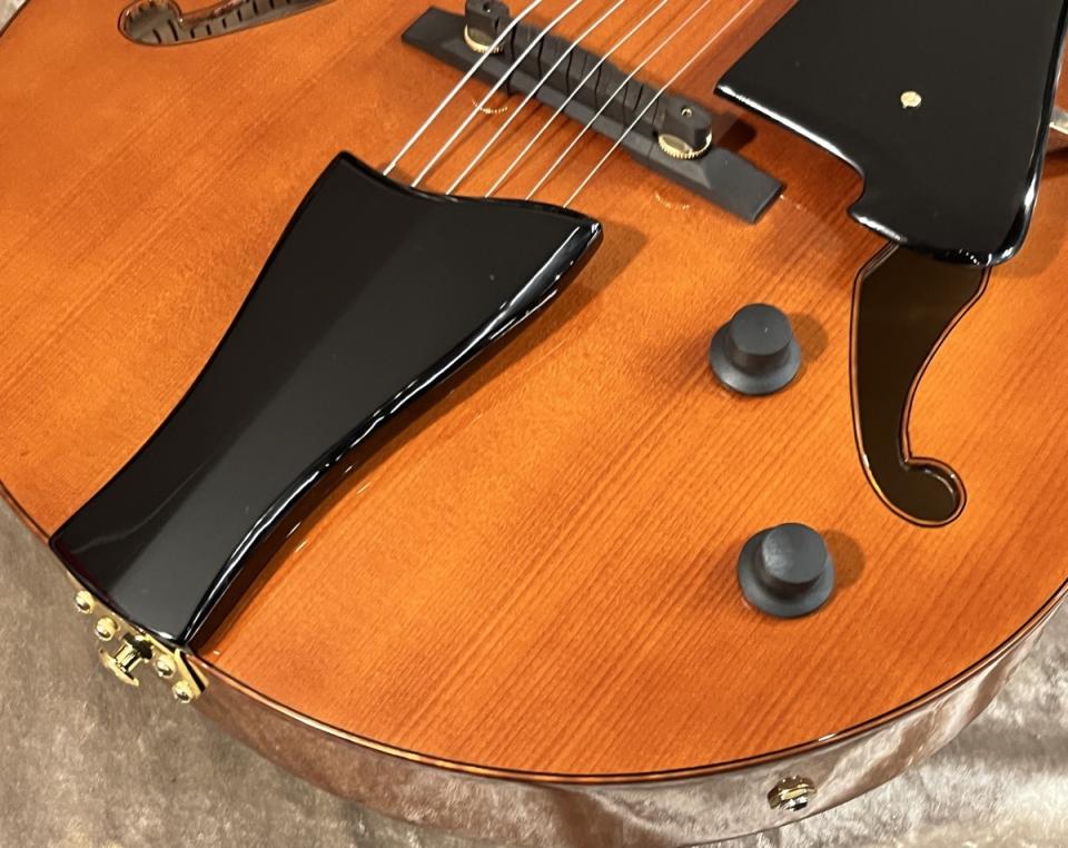AFC151はArtstarシリーズの最新モデルです。ボディは16インチ(約405mm)幅とフルアコとしては一般的なサイズです。厚みはやや薄めの2.75インチ(約70mm)。このサイズは抱え込みやすく長時間の演奏にも有利と言えるでしょう。ボディマテリアルはスプルーストップ、メイプルサイド&バック。音の輪郭がはっきりする組み合わせです。