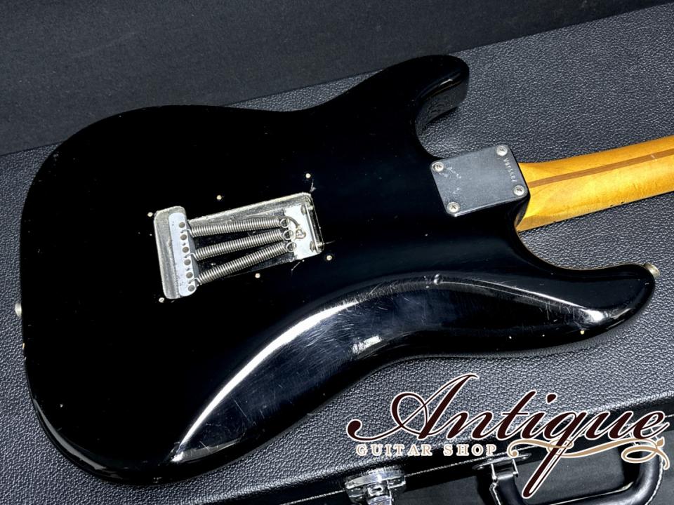 まずそのスペックとしては、1957年製のストラトキャスターの仕様を踏襲しており、アルダーボディに1Pメイプルネックの王道スタイル。中でも1970年代中期より1980年代にかけては、3.8kg前後、4kgオーバーの個体も少なくない中、こちらは約3.46kgとストラトモデルのベストウェイトを実現。フィニッシュは当時のカスタムカラーの中でもズバ抜けて高い人気を誇るブラックフィニッシュ。続いてネックにはトーン重視となるフラットソーン(板目取り)メイプルが1Pにて採用されておりますが、硬質材の証でもあるフレックラインも入っており、見るからに音抜けの良さが伺えます。その他としては8点留め1プライのホワイトガード、FENDER刻印サドルのシンクロブリッジ、7.25’Rのヴィンテージラディアスにミディアムサイズ21F仕様、一般的なミディアムCよりも若干薄めのネックプロフィール、ブラックドットマーカー、スモールヘッドにスパゲティロゴ、Vシリアル刻印の4点留めジョイントプレート、クルーソンチューナー等の仕様が確認出来ます。