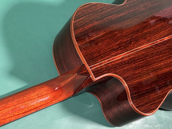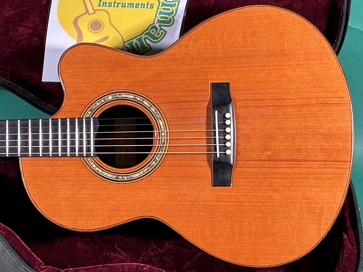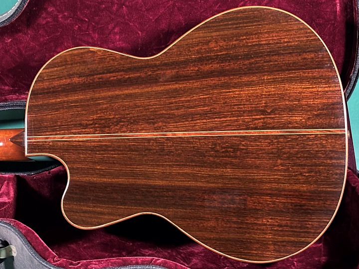 本モデルは、マンザーギターの中でもスタンダードなスタイルとされる一本で、優れた演奏性とサウンドバランスを備えています。トップはウェスタン・シダー、サイド&バックはインディアン・ローズウッド、ネックはマホガニー、指板・ブリッジはエボニー。ナット幅は44mm、スケールは約650mmで、ハイポジションでの演奏をスムーズにするためカッタウェイが採用されています。