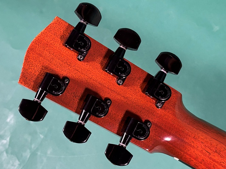 ボディ・指板はシンプルながら、ヘッドにはカスタムインレイで「龍」の装飾が施されており、非常に印象的なルックスです。ピックガードはクリアタイプ、ペグはシャーラー製で動作もスムーズです。