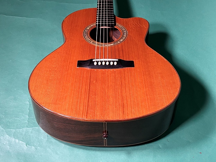 サウンドもシダーならではの深みと高音弦のクリアでレスポンスの良さ、低音に埋もれずバランスよく響きます。各弦の輪郭も明瞭で艶があり、倍音も豊かです。フィンガーピッキングでは上品に、オープンチューニングでも心地よく鳴り、まさに唯一無二のサウンドです。