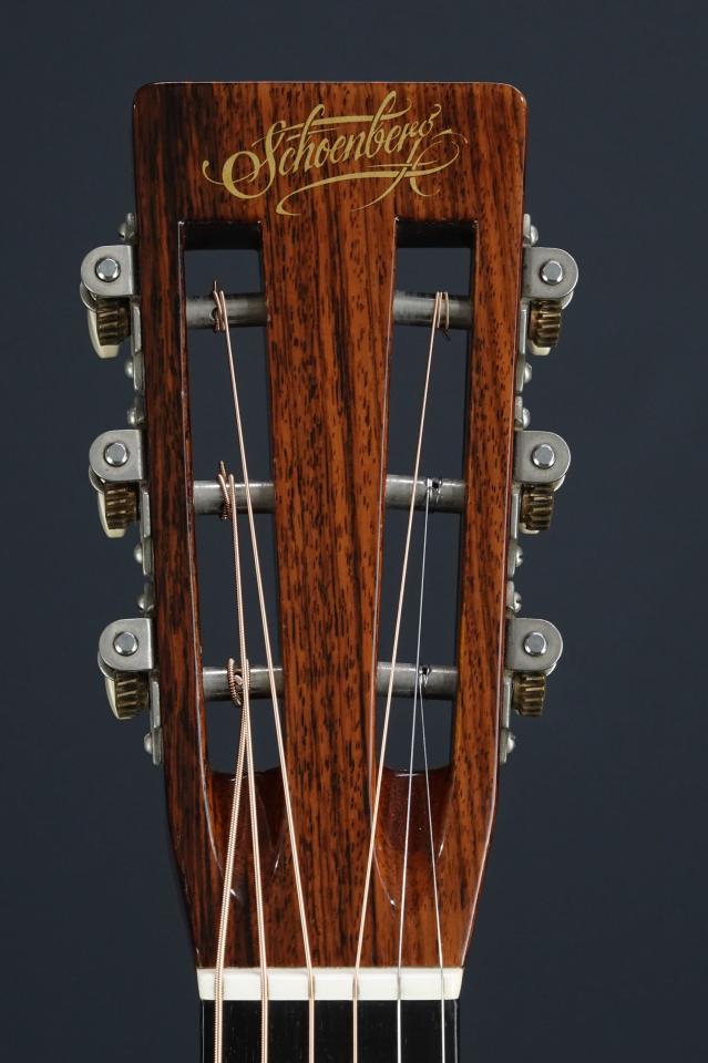 28スタイルの四角い穴のスロテッドヘットにはローズウッドのヘッドプレート、そこに金色のSchoenbergのロゴが入り、チューナーはアイボロイドつまみのオリジナルウェーバリーです。