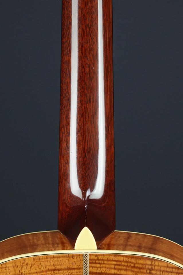 まず目を惹くのはボディ材に用いられたハワイアンコアの美しいフィギュアドの杢目で、サイド&バック材はもちろん、トップ材にも最高級の素晴らしい杢目が入ったハワイアンコア材が用いられ、陰影深い縞模様の独特な色のコントラストがとても綺麗な、コア好きな方には堪らないルックスをしております。