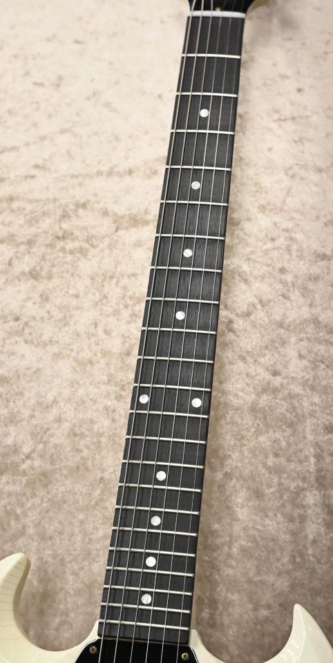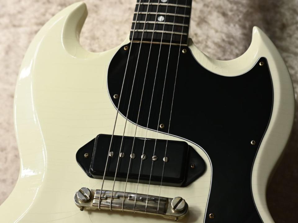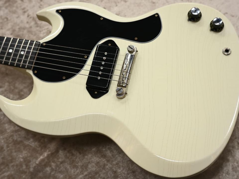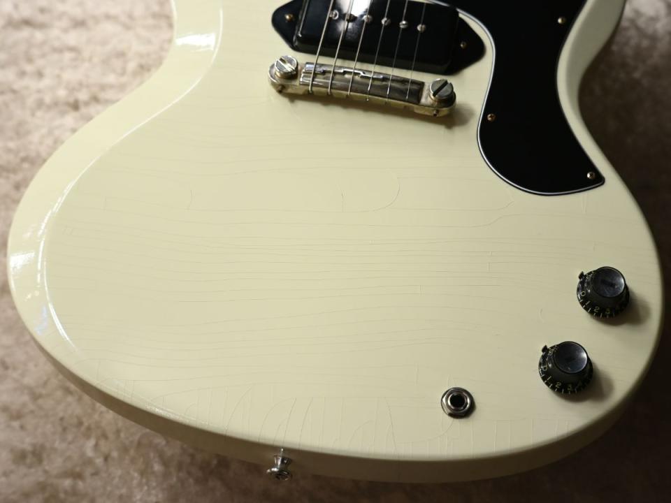こちらの1963 SG Juniorは、限定カラーのポラリスホワイトで仕上げられており、非常に深くウェザーチェックの入った個体です。
