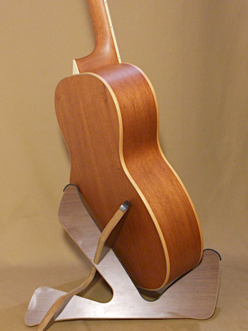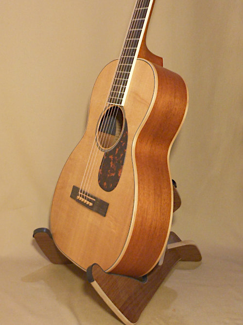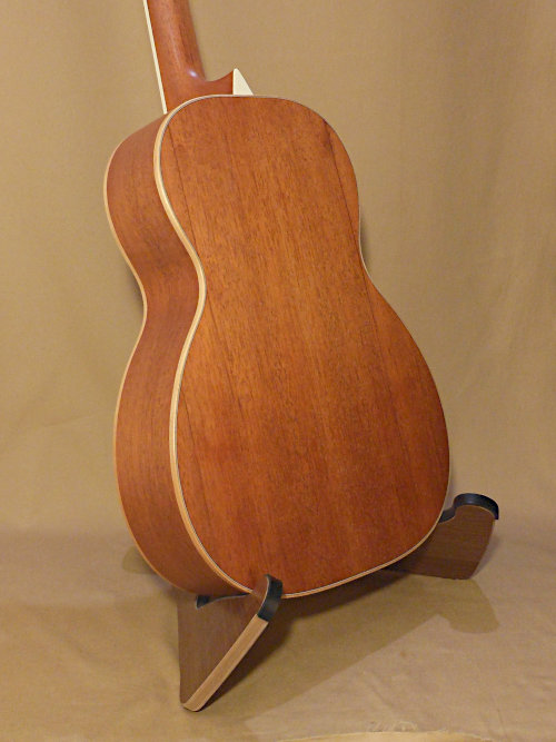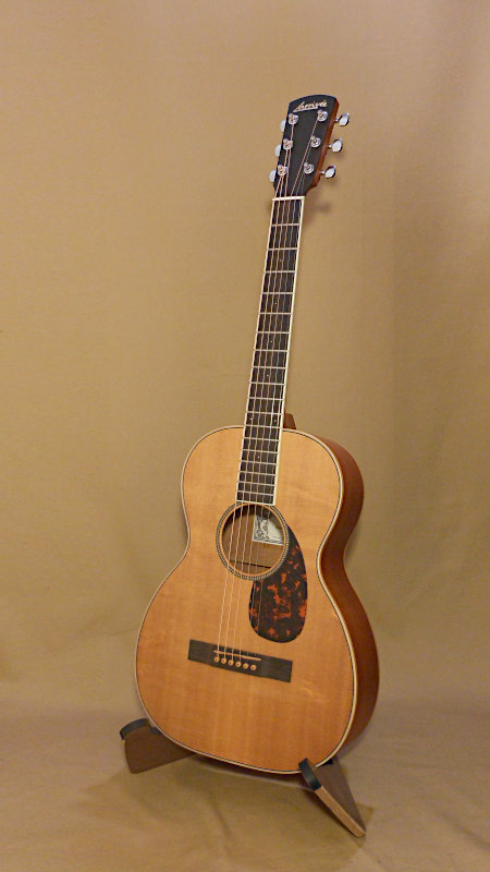 1967年にカナダのバンクーバーでスタートして、現在は米カリフォルニアに工場を持つラリビーギター。豊かな森林資源をバックグラウンドに持ち、その質の良さにも定評のあるメーカー。こちらのモデルはボディ幅が330mmほどに12フレットジョイントのコンパクトでかわいらしいパーラーサイズギターです。シトカスプルーストップにマホガニーサイド&バック、ワンピース・マホガニーネック。ヘリンボーンのサウンドホールリングにべっ甲柄ピックガードがビンテージ感を添えつつもメイプルのバインディングなどラリビーらしいウッディ感溢れるルックスです。ボディも抱えやすいサイズですが、スケールも610mmと短めですので大変弾きやすく、長時間弾いていても疲れないギターでしょう。クリアーで気持ちの良い音抜け。ラリビーオリジナルのシンメトリカル・パラボリックXブレイスによるバランスの良いサウンドはフィンガースタイルにもマッチします。10年以上経過しているものの外観は大変きれいな状態です。使用感も薄く、消耗品の減りもごくわずか。演奏性も良好な状態です。