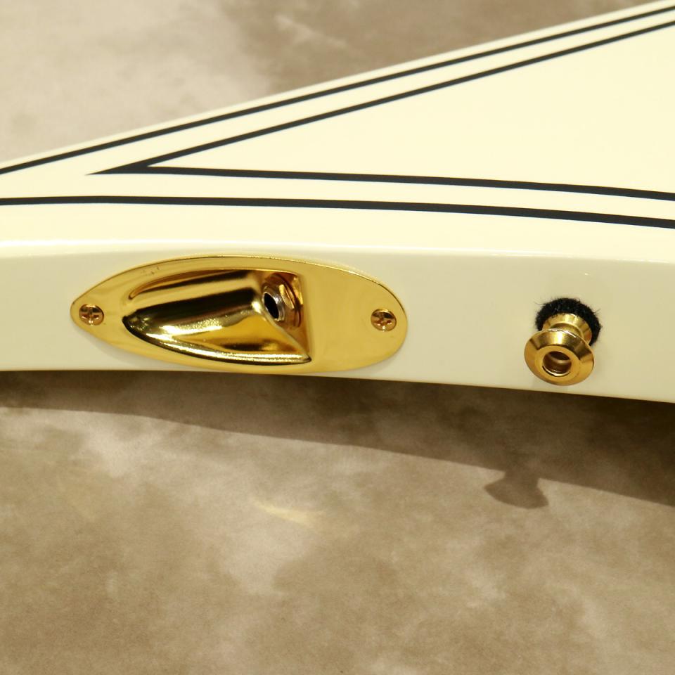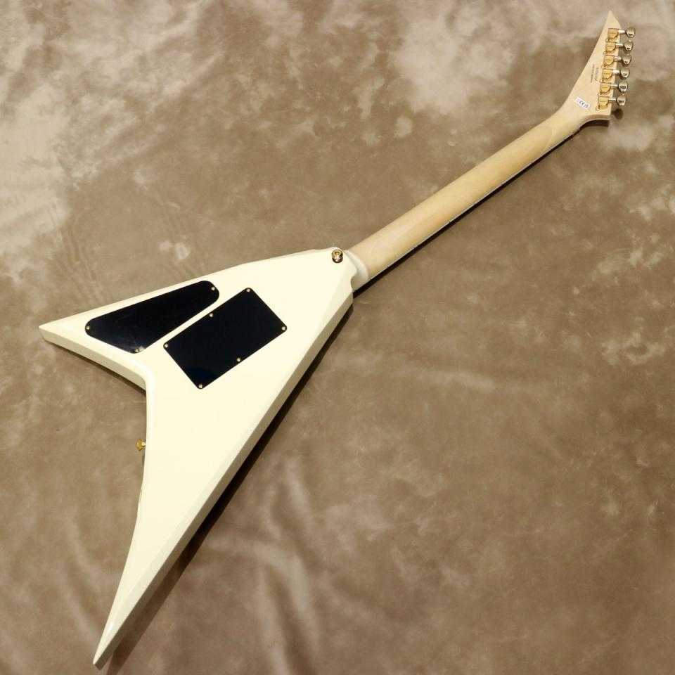 RHOADS RR3 IVORY WITH BLACK PINSTRIPES は 、グラファイトで強化された 1 ピース・メイプルのスルーネック構造 にオフセットされた V スタイルのウイング材にマホガニーを 採用したモデルです。コンパウンド・ラジアス ( 16”) を採用したエボニー・フィンガーボードには、パーロイドを使用したシークフィン ・インレイが施されています。