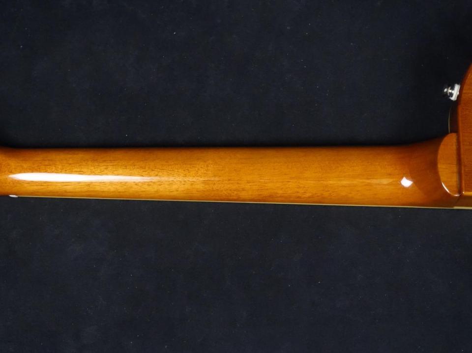 ロング・ネック・テノン仕様でジョイントされた50sシェイプ・マホガニー・ネック、クラシカルなディッシュ・インレイが施されたインディアン・ローレル指板。