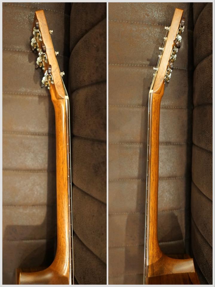 ネック材に軽量なスペイン杉を選択し、トラスロッドを敢えて調整機構のないTバーに置き換えるなど、
