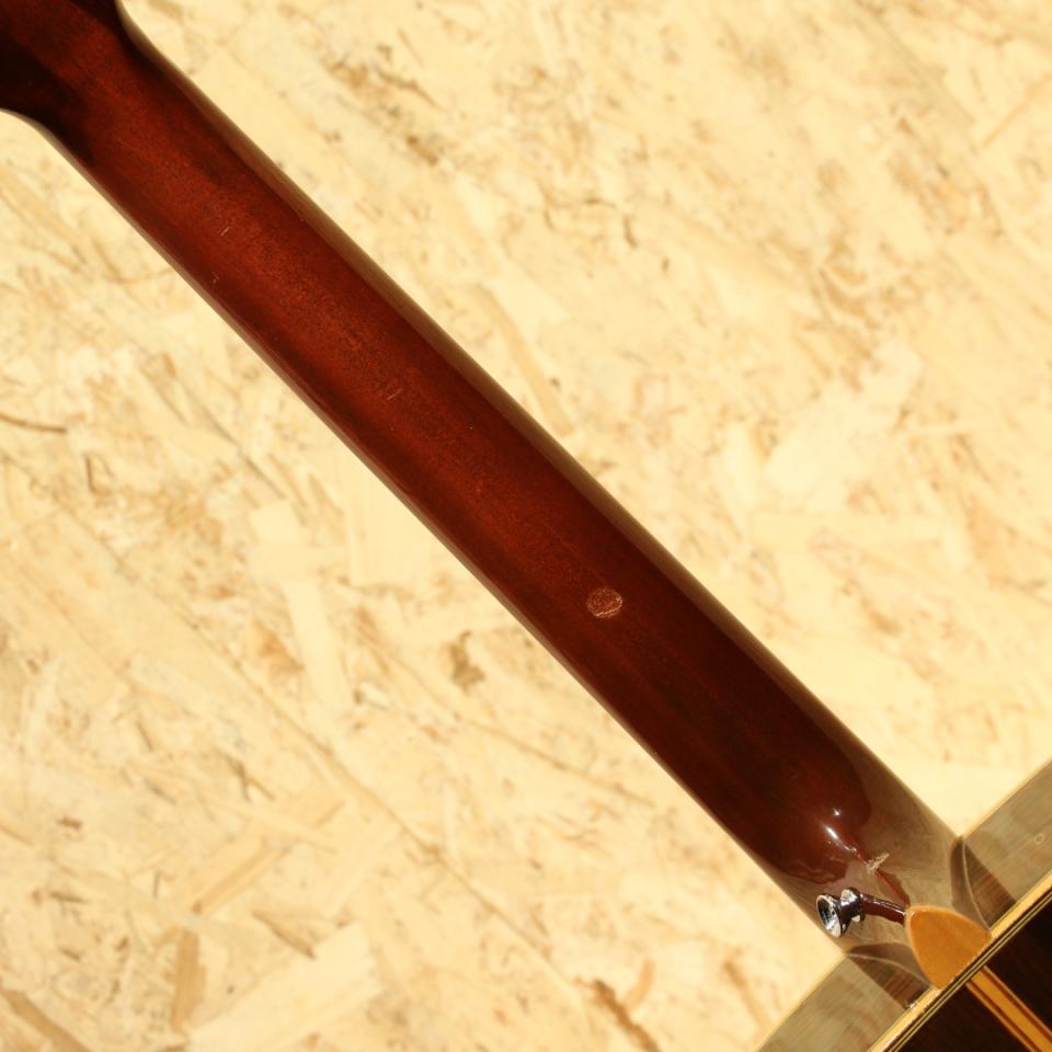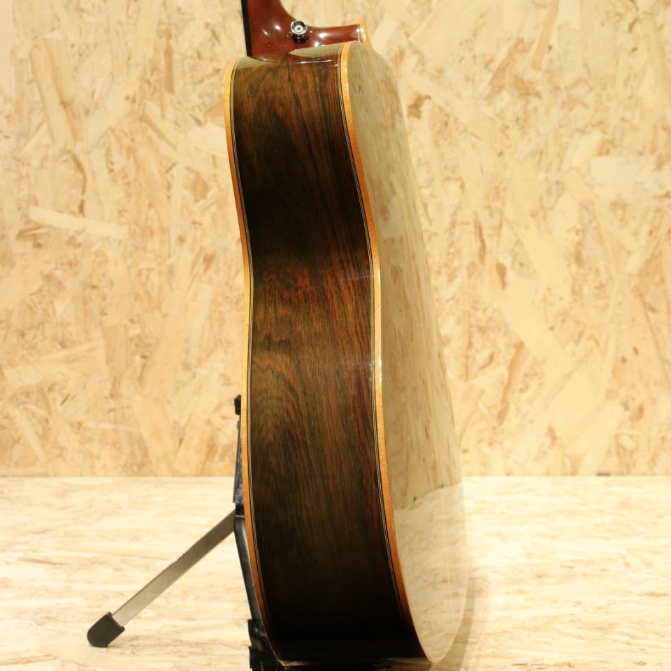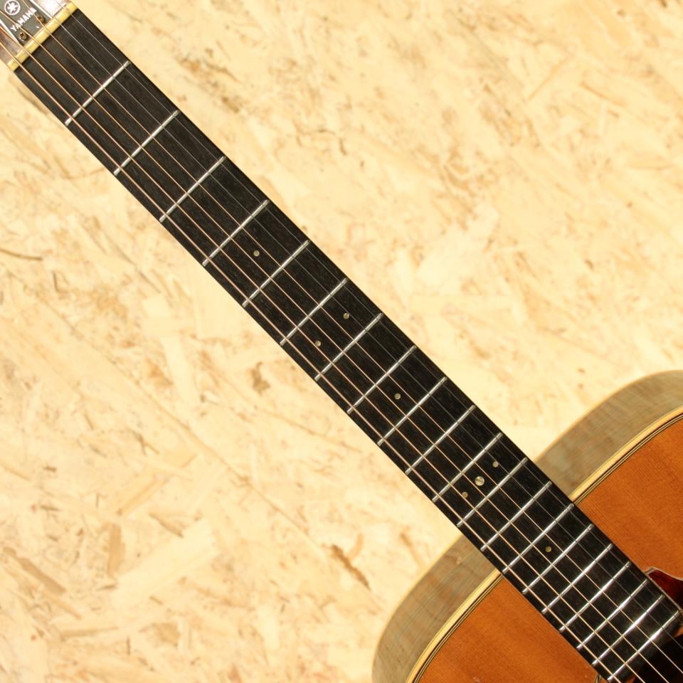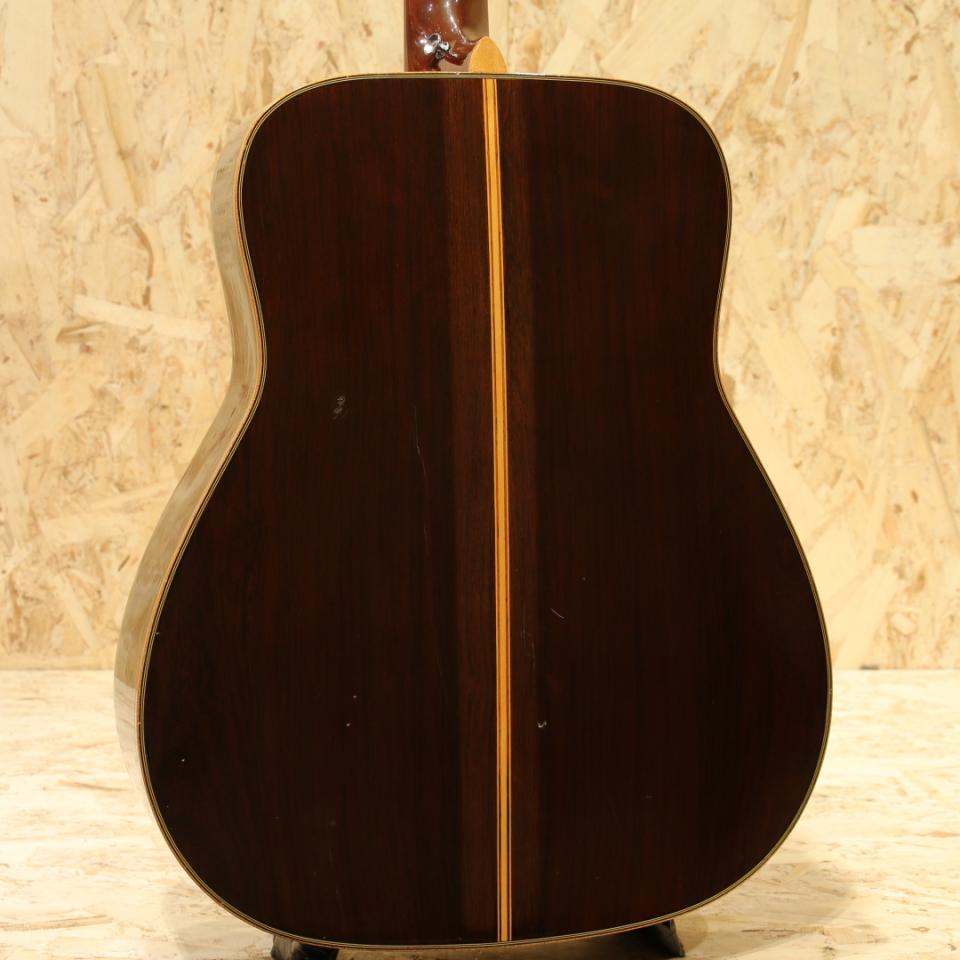 ヤマハフォークギター"FG"シリーズの最上位モデルとして君臨した"FG-500"。1969年から1972年までのおよそ3年間しか生産されず、大変希少なモデル。FGとしては初の単板モデルとしてラインナップされました。スプルーストップ、ハカランダサイド&バック。エボニー指板&ブリッジ、グローバーロトマチックペグ、音叉ヘッドマーク、ロープロゼッタモザイク、ウッドパーフリング &バインディング、べっ甲柄ピックガード、ノンスキャロップドXブレイシング。トップ材とバック材は単板仕様。赤ラベルでボディ材に単板が使われているのはこの機種のみで、ほかの姉妹品にあるようなマイナーチェンジは生産開始から廃盤に至るまで一切おこなわれなかったモデルです。圧倒的にパワフルな鳴りを持ち、ハカランダ特有の重厚さ、キレの良さも味わえる魅力たっぷりなサウンド。ペグはオリジナルからグローバー製クロームロトマチックタイプへ交換、その際元々の木ネジ穴が埋められておりヘッド裏に視認できます。バック面ロウワバウト端に割れ修復歴がありますが、しっかりとリペア済。その他、ネック裏やネックヒールの打ちキズによる塗装剥がれやトップ面下部の大き目な打痕、バック面のバックル傷、バインディング際のへこみなど経年相応の使用感はありますが、しっかりと使い込まれてきたことのうかがえる良い顔立ちです。ネックの状態も良好、セットアップも素晴らしく、とても弾きやすいセッティングです。昨今、出物も少なくなってきている人気機種”FG500”。汎用ハードケースが付属します。