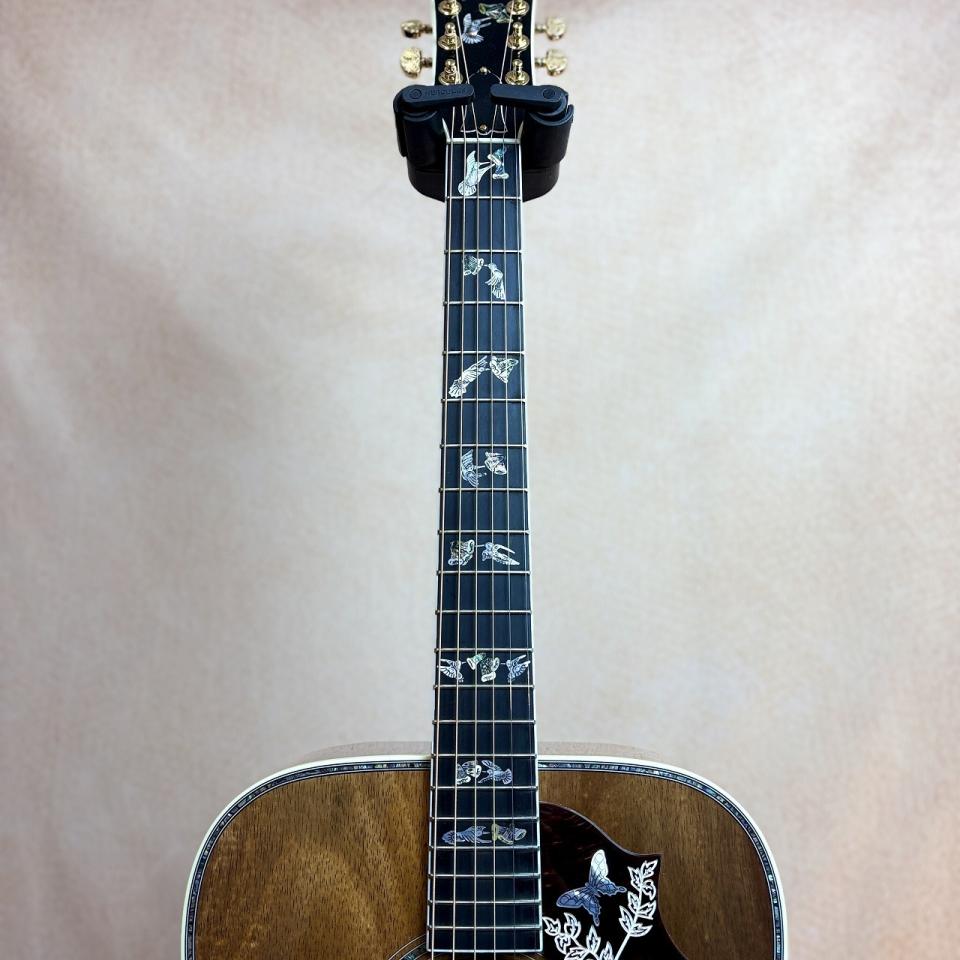 本モデルは、希少性の高いAAAグレードのハワイアンコアをトップ・サイド・バックすべてに採用した、特別仕様の1本です。ヘッド、指板、ブリッジ、ピックガードには美しい貝装飾があしらわれ、指板上に舞うハチドリのインレイは、とてもかわいく美しい存在感を放ちます。ロゼッタやバインディングにもアバロンを使用し、ゴールドペグには彫金を施すなど、細部までこだわり抜かれています。
