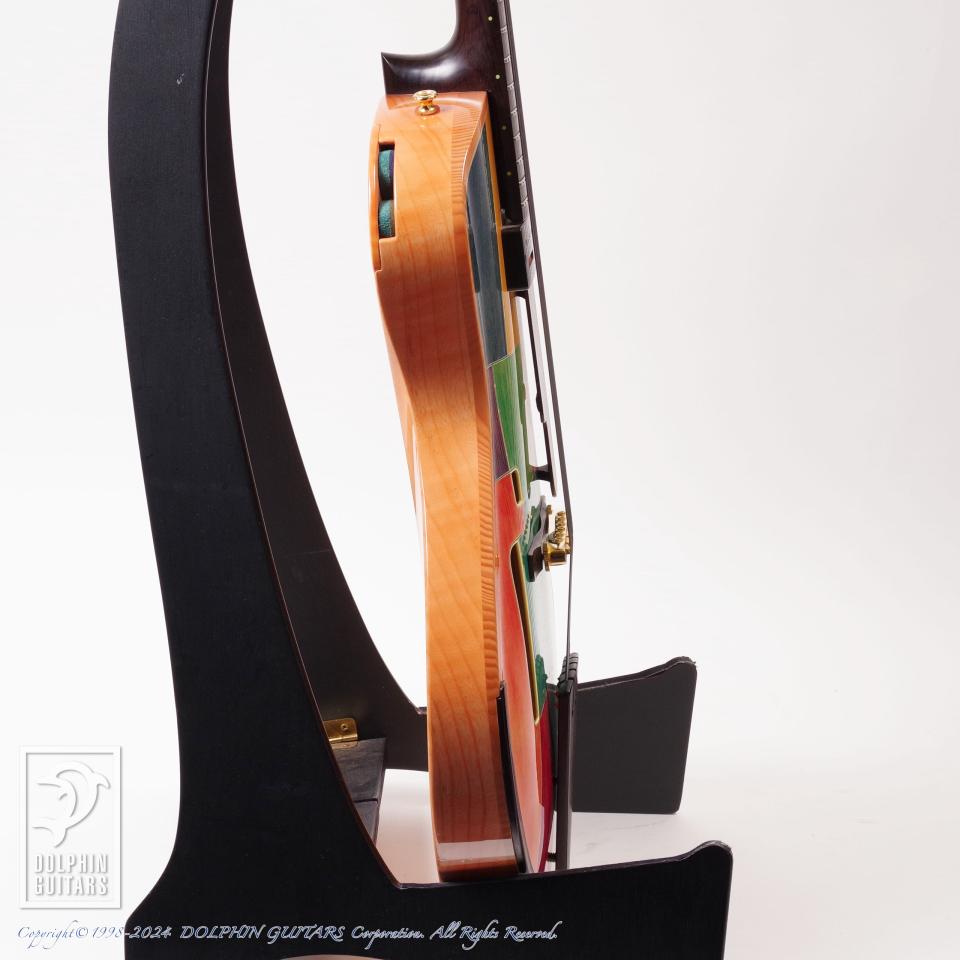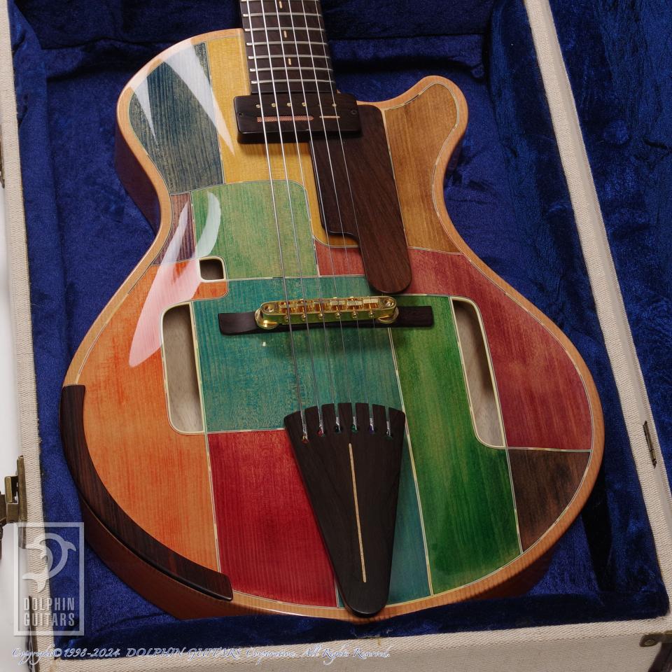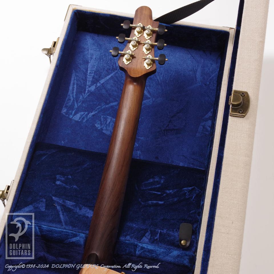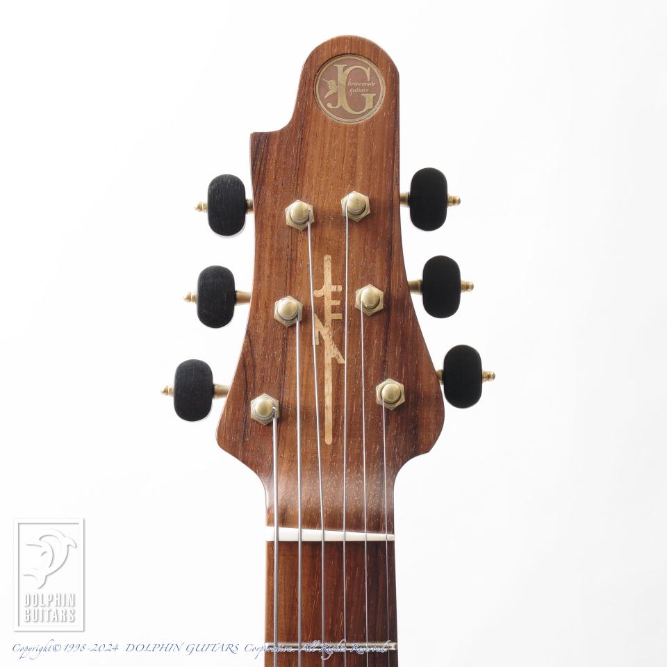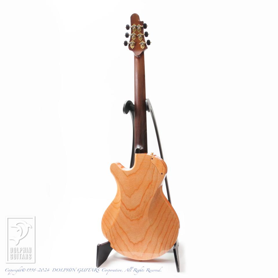 独創的なデザイン、精巧に作り上げられた各部パーツ類、高い木工精度やフィニッシュの美しさなど、すべてが完成度の高い逸品。ピックアップまで製作するという徹底したハンドメイドを貫いており、これこそ唯一無二の存在であります。多くの方が現物を見ることができない事から幻のギターと言われるほどの激レアギター。中でもこちらはハカランダ1ピースネック仕様と、非常に珍しい個体であります。