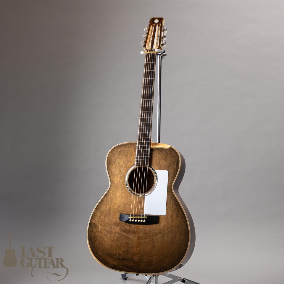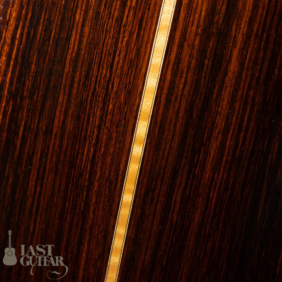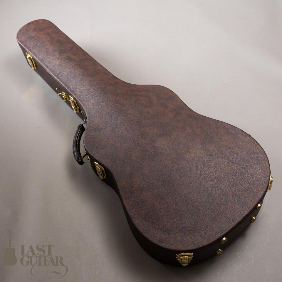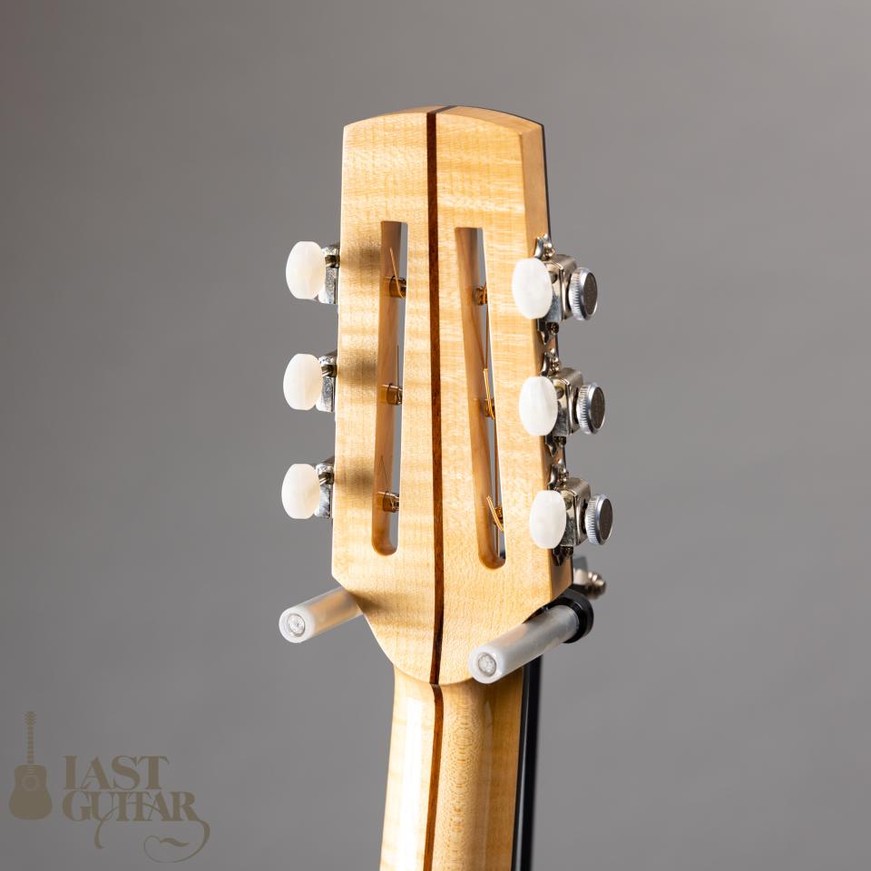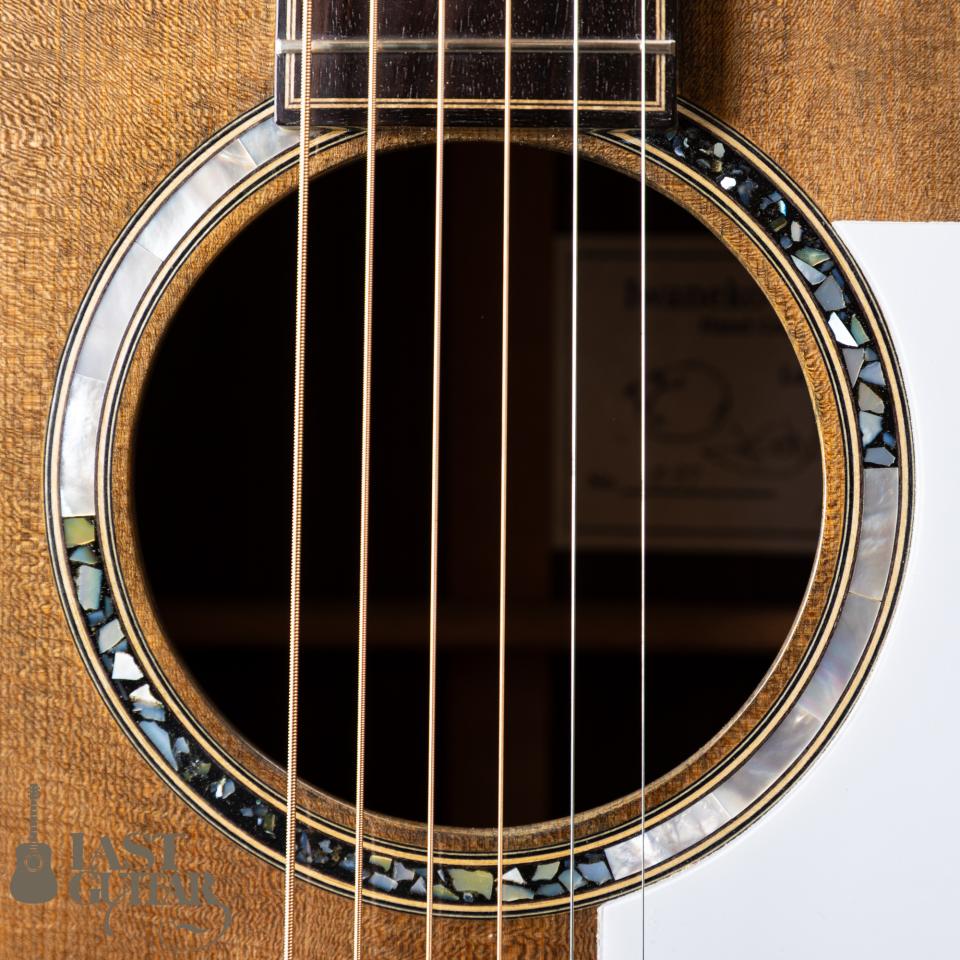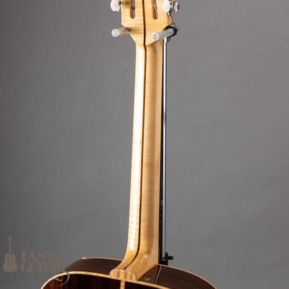 トップは、雰囲気たっぷりのベアクロウ・シトカスプルーストップ、サイドとバックは、きれいに整った木目のインディアンローズウッドです。ネックは、メイプル&ローズ3P、フィンガーボードとブリッジは、良質なエボニーです。ネックまわりにつきましては、43.5mmナット幅に、わりと厚みがあるラウンドシェイプです。ブレイシングは、岩根さんお馴染みのダブルXのスキャロップスタイルで、しっかりした出音と強度を兼ね備えています。また0フレット仕様もお馴染みのスペックで、開放弦の響きがきれいです。ボディフィニッシュは、手間のかかるシェラック仕上げで味わいがあります。ペグは、ロック式ですのでスロテッド仕様ながら弦交換が楽にできてプレイヤーにはうれしいポイントと思います。