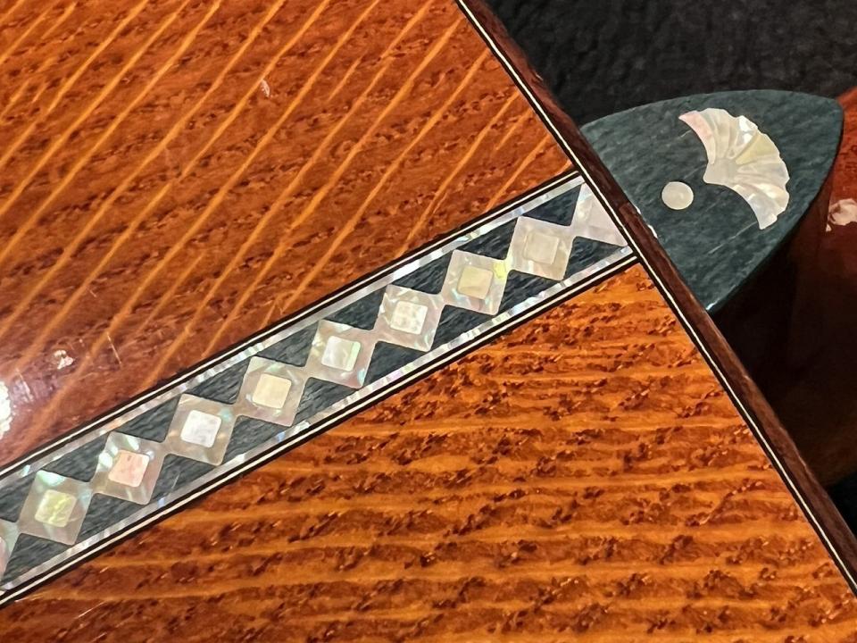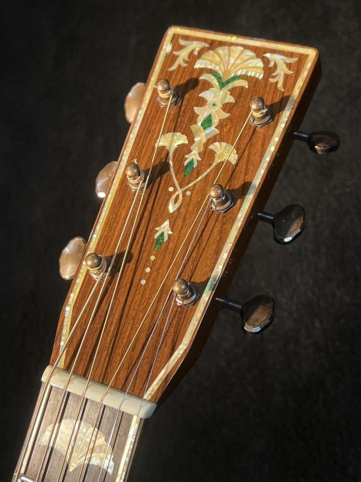 何より目を見張るのは装飾。グァテマランローズウッド製ピックガード、突板、指板を彩るデザインインレイ。それはネックヒール上にも及びます。もはや工芸品の域に達しています。