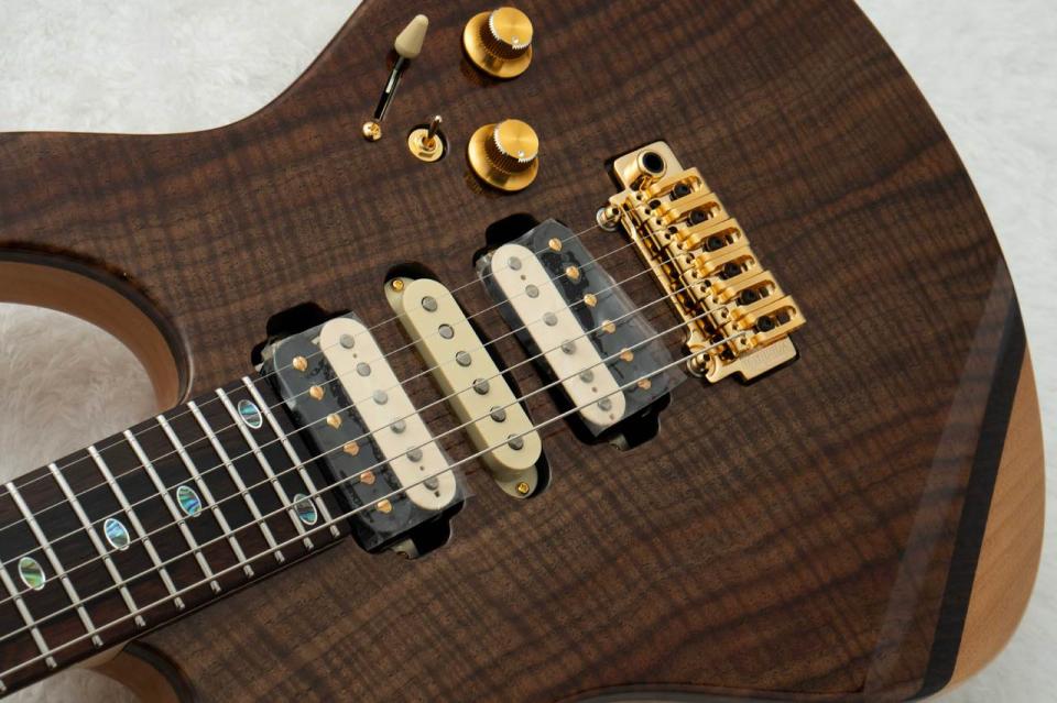 ボディトップには当店にて選定を行った貴重なフレイムウォルナット材をトップに採用した一本。