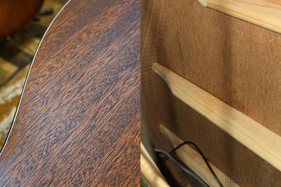 ボディ材はスプルース単板トップにサペリ単板のサイド&バックのオール単板仕様となっており、指板とブリッジはリッチライト、音色は柔らかめな印象で、ボッサやポップスなど弾き語りのスタイルによくマッチする印象です。