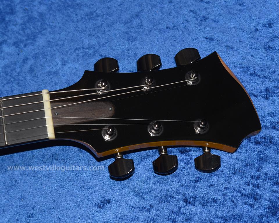 ボディは削り出しのシトカ・スプルース単板トップ、センターブロック部分と一体で削り出された単板のハードメイプル・サイドリム、そして同じく削り出しのハードメイプル単板バックという、「オール削り出し単板」構造。Westvilleのスタンダード・モデル「Butter」をさらに進化させた、ハイスペックなセミホロウ・モデルです。