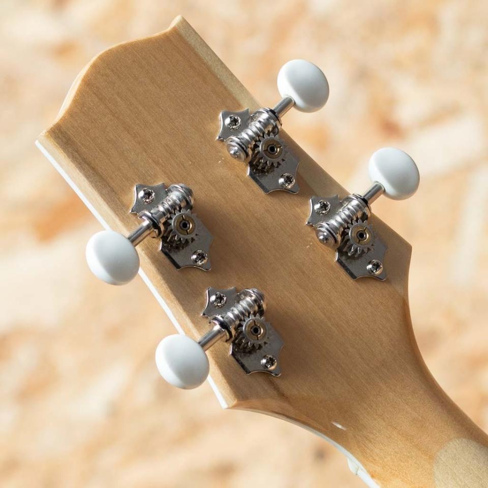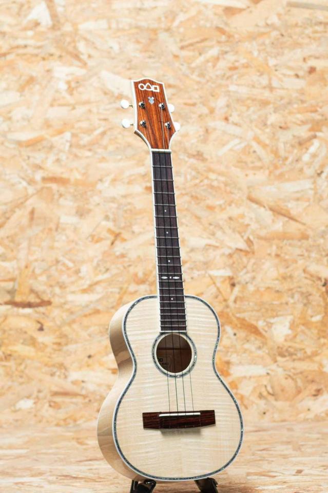 京都市の工房にて占部英明氏、息子の直宏氏によって製作されるハンドメイドウクレレ。本器はウクレレプレイヤー”名渡山遼”氏が愛用していることで有名な”ビッグ・テナー”サイズの1本。きれいな杢のシカモアボディ、メイプルネック、ローズウッドブリッジ、エボニー指板、ホワイトバインディング、アバロントリム、アバロンロゼッタ、ゴトー製ギヤペグ。容積の大きなボディでエアー感のあるふくよかなサウンド。占部ウクレレ特有のやや薄めで握り易いネックシェイプ、0フレット仕様でローポジションの弾き易さは格別。14フレットジョイント仕様で演奏性も高く、一般的なテナーサイズよりも長い442mmスケールを採用することで、音色のハリ、音量、安定感は占部全サイズの中でもダントツに優れております。ストラミングでも単音でも、しっかりとした反応で応えてくれる、プロ志向モデル。美しいシカモアの杢とアバロンの装飾がマッチした高級感のある1本です。