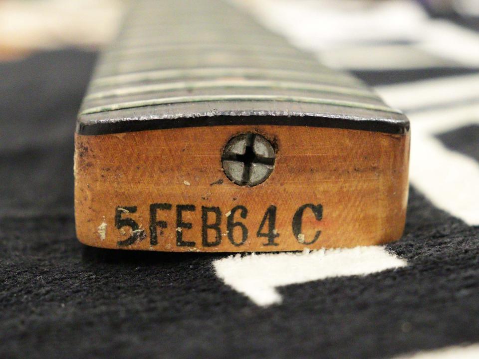 定番の「Sunburst」カラーにて仕上げられたアルダーボディ、クレイ・ドットのポジションマークにラウンド貼りのハカランダ指板、ヘッドにパテントナンバー4個入りサードヴァージョンのスパゲティロゴ/ネックエンドに「5 FEB 64C」スタンプが確認できるメイプルネック。