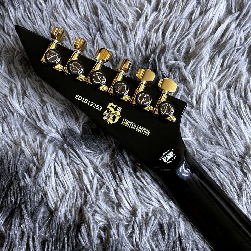 ゴールドパーツが高級感を演出し、さらにはヘッドのEDWARDSロゴは薄い白蝶貝を貼り付ける螺鈿を採用、また、ESPの50周年ロゴがトラスロッドカバーとヘッドバックに入れられています。まさにアニバーサリーモデルに相応しい特別感を備えたルックスに仕上がっています。