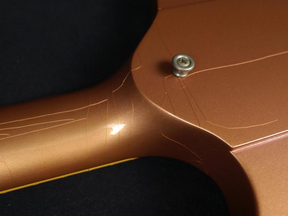 フレットは全体的に6割程度の残りとそれなりに消耗されているものの、局所的な凹みや顕著な凹みはなく、気になるようなビビりや音詰まりはありません。