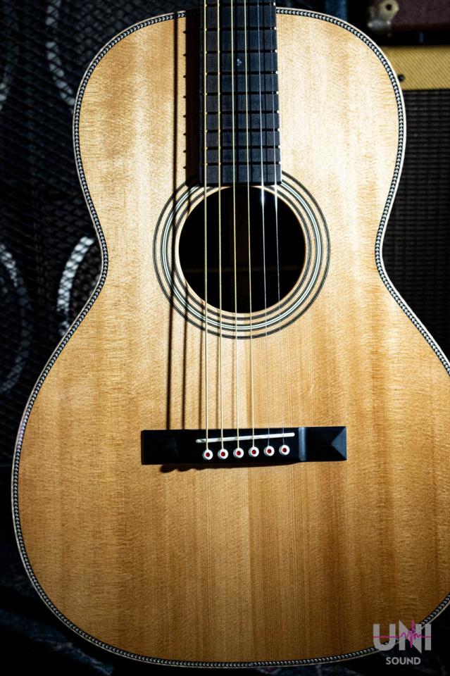 00-12Fretという伝統的なボディサイズにTOPにはシトカスプルースwith VINTAGE TONE SYSTEM(R)(VTS)、天然系の接着剤(ナチュラルプロテイングルー)を使用し、外観は、ヨーロピアンフレイムメイプルバインディング(ボディ、指板、ヘッドプレート)、スタイリッシュなゴールドフレット、ゴールドのオープンギアチューナー、ヘッドストックには1930年代スタイルのスクリプトロゴをパールにてデザインされています。