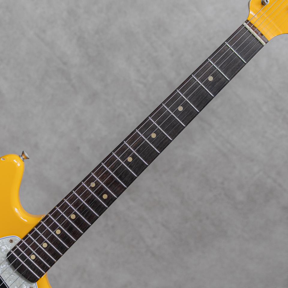 “Neo Vintage”を感じさせる”Vanzandt”。数多くのミュージシャンから愛されたテキサス生まれの”Van Zandt”ピックアップを搭載し、国産の確かな技術で作り上げられるギターは、その価格以上のクオリティを感じずにはいられない実力派ギター。本器はショートスケール・オフセットボディの"MGV-R2"。オレンジカラーにハカランダ指板にコンペティションラインのオプションがグッドルッキンの1本。アルダー2pcsボディ、こだわりの板目取りメイプルネックにスラブ張りのハカランダ指板を採用、ネックグリップは22フレット仕様の60 Style Oval Cシェイプで、厚すぎず薄すぎない弾き心地の良いネックシェイプ。ピックアップにはST Flat-Pole×2を採用。軽快さの中にもザクっと輪郭が鮮明でワイルドな印象が魅力。ショートスケールながらしっかりとミドルのコシがあり、歯切れの良い響きとも相まってこのスタイルに求めるキャラクターを存分に楽しませてくれる高い完成度。ドライブの乗りも良く、分離感の良い潔いアウトプット。取り回しの軽快さとともに無心にかき鳴らしたくなる1本です。こちらボディエッジなどに~1cm程度の塗装チップや塗装の擦れ、細かな小傷や打痕などはあるものの目立ってカッコ悪くなってしまうような外観のダメージはございません。その他電装の機能面、演奏性もばっちりの即戦力コンディション。ロッドの調整を含め良好なネックコンディション。まだまだ沢山弾き倒して外観の雰囲気が出てくる様子も、薄いニトロセルロースラッカーのVanzantならではの楽しみ。現在はモデルラインナップに含まれていない"MGV-R2"、珍しいハカランダ指板スペック、ぜひお見逃しなく。オリジナルのギグケース、アームが付属。