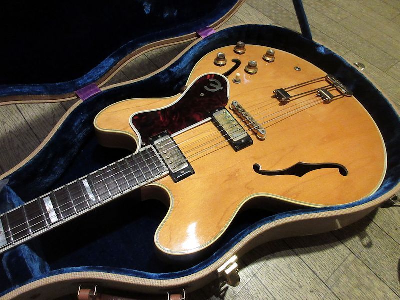 エピフォンセミアコーティックギターのトップラインモデルとしてラインアップされていたシェラトンはリヴィエラの上級モデルにあたり、Gibsonで言うところの355と335の関係性にあたります。ラミネイトメイプルボディー、マホガニーネック、ハカランダ指板にミニハムバッカー2基搭載。本機はGibson ESシリーズ同様、極端に生産本数が少ないスーパーレアなブロンドカラー!しかも42mmワイドピッチの時期ですので非常に入手困難な時期の逸品です。現在はフリークエンセイターテイルピースがマウントされておりますが、オリジナルはトレモトーンマウントにて出荷されたと思われます(取り外されたトレモトーンユニットが付属致します)その他はブリッジサドルの交換のみで、オリジナリティーの高い個体。塗装など木部のコンディションも非常に良好で、ハカランダ指板にミニハムバッカーの組み合わせは、澄み切ったトーンを生み出し、軽く歪ませると艶っぽさが際立つ素晴らしいサウンド!固すぎることもタイトすぎることもない絶妙な柔らかさです。1964年製Sheratonのブロンドカラー生産本数は約10本程度。滅多に出ないスーパーレアギターですのでお見逃しなく!Epiphone純正ハードケース(Tan Color Case)付属。