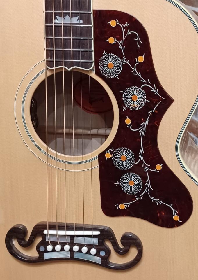 この度オリジナル・コレクションからリリースされたSJ-200 Originalの特筆すべきポイントは、4個のMOPの装飾をもつ削りだしによるマスターシュ・ブリッジ、彫刻の技法で仕上げられたトータス・ピックガード、MOPによる指板上とヘッドストック上のクラウン・インレイ、非常に美しいメイプル材によるフレーム杢が顕になったバック材とサイド材など、充実の仕様の数々です。