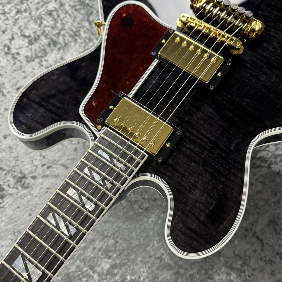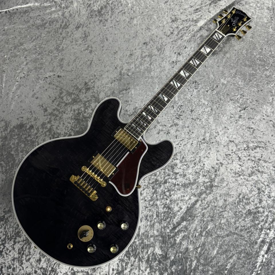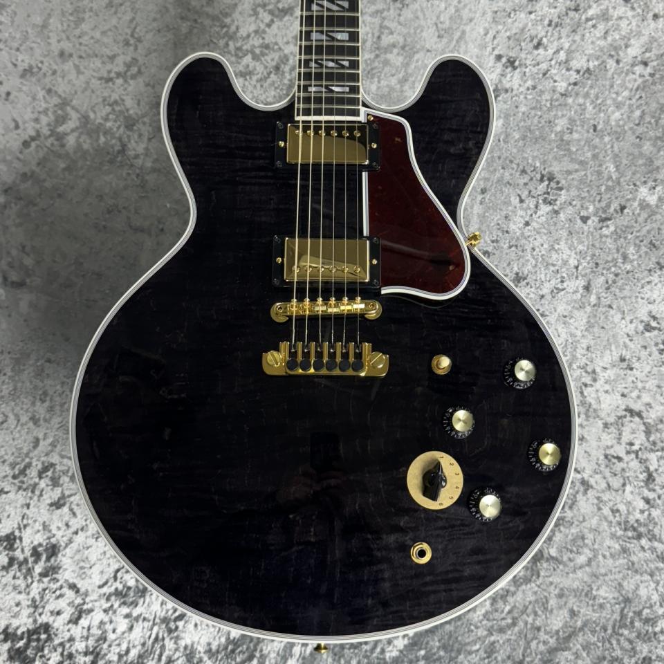 セミホロー・ボディーのままFホールをなくすというB.B.キングのリクエストは継承し、ボディに美しいフィギュアド・メイプルとトランスペアレント・エボニー・フィニッシュを採用した新たなルシールは、ブルースのキングの名にふさわしい特別仕様となっています。