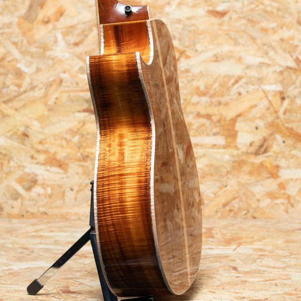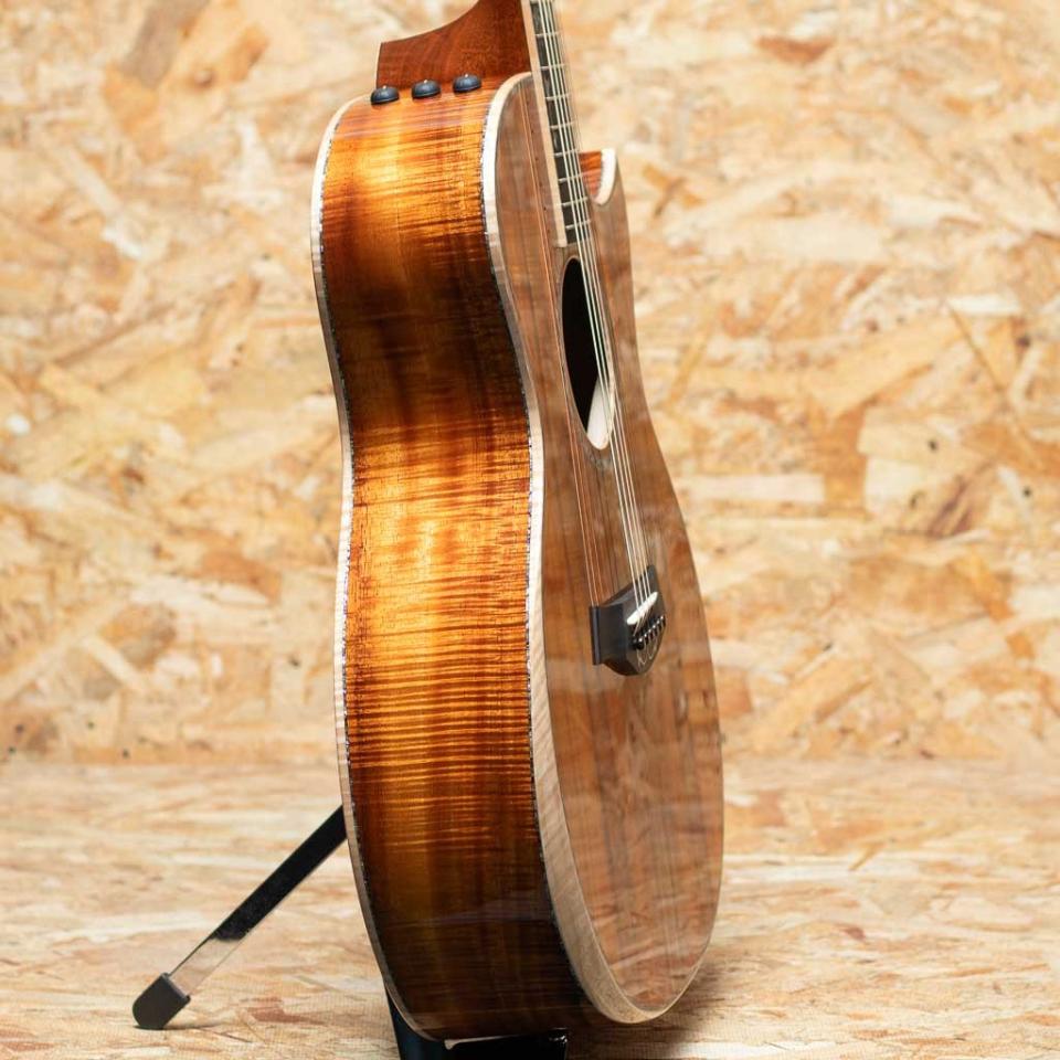 2000年代より急速に成長し画期的なギター構造を採用した事によって世界のトップアコースティックブランドに成長したテイラー社。国内をはじめ特に米国ではプロミュージシャン使用のシェアが高く、圧倒的な人気を誇っています。本器は三木楽器創業200周年を記念して弊社スタッフがテイラー社現地にてCEO兼、マスタールシアーであるアンディ・パワーズとともに材選定を行ったカスタムオーダー品”Grand Auditorium Custom”。グランドオーディトリアムボディ、マスターグレードハワイアンコアボディ、フィギャードマホガニーネック、エボニー指板&ブリッジ、ベベルコンター、ハワイアンコアヘッド突板、フィギャードメイプルバインディング、ゴトー510ゴールドペグ、ES2ピックアップ搭載。ボディに使用しているハワイアンコアは益々確保が難しくなっているフィギャード杢が全面に浮かび上がっているマスターグレードのハワイアンコアを採用。同じくフィギャード杢のマホガニーをネックに合わせることで、天然の造形美を全ての角度からご高覧いただけます。パフォーマンスXブレーシングを採用しており、Vブレーシングとは違ったファットなパワフルさを持ち、オールハワイアンコア仕様ならではの豊かで、甘く、柔らかい中音域にキラキラとした輝きある高音が心地よく調和するサウンド。指板には"Tropical Vine"インレイ。ヘッド、ブリッジには“Byzantine”スタイルのデザインインレイが施され、ロゼッタやボディトリムの装飾に至るまで、パウア貝と白蝶貝を惜しみなく用いた、極めて華やかな仕様。音質と外観が高い次元で融合した、まさに逸品と呼ぶにふさわしい一本です。特別な1本をお求めの方に是非とも手にしていただきたい1本。ぜひご検討くださいませ。