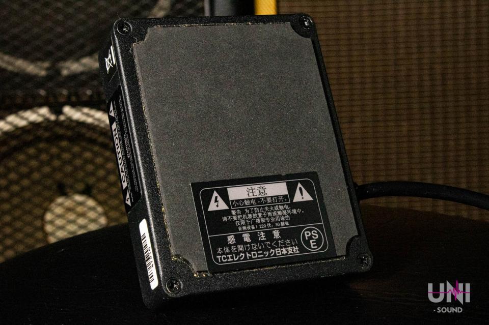 紫のラインが入っていない、白文字の筐体で、電源のケーブルが直付けです。こちらは復刻版で、裏には「TCエレクトロニック日本支社」のプレートが貼られています。